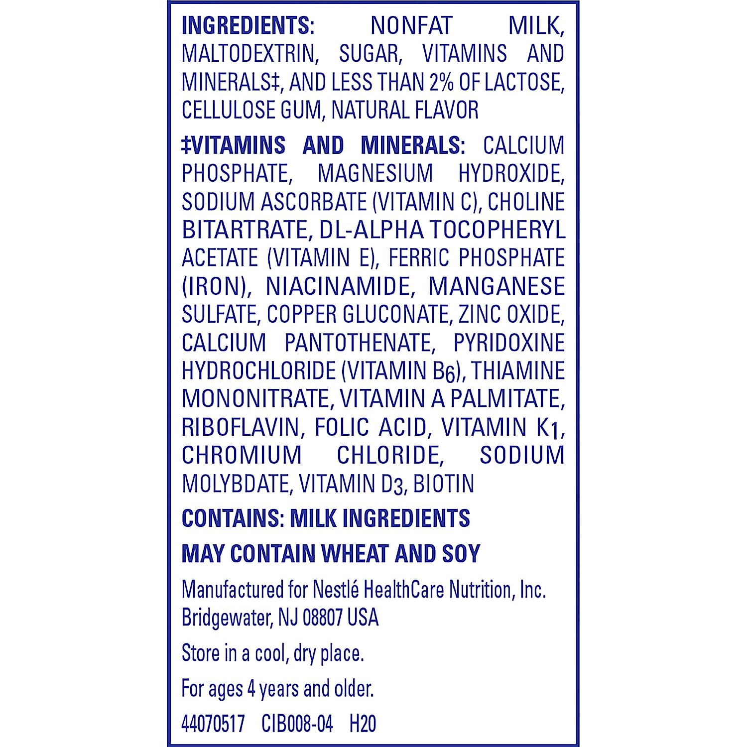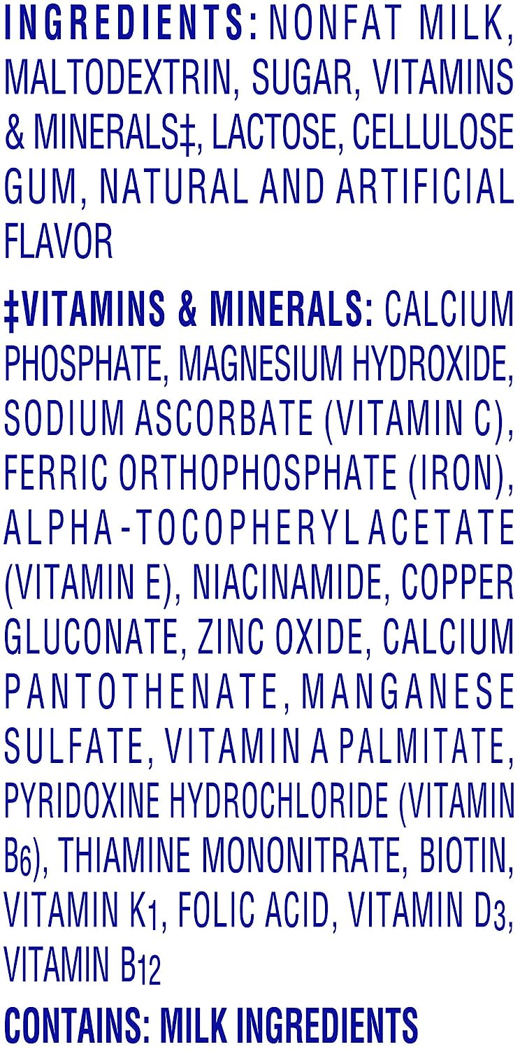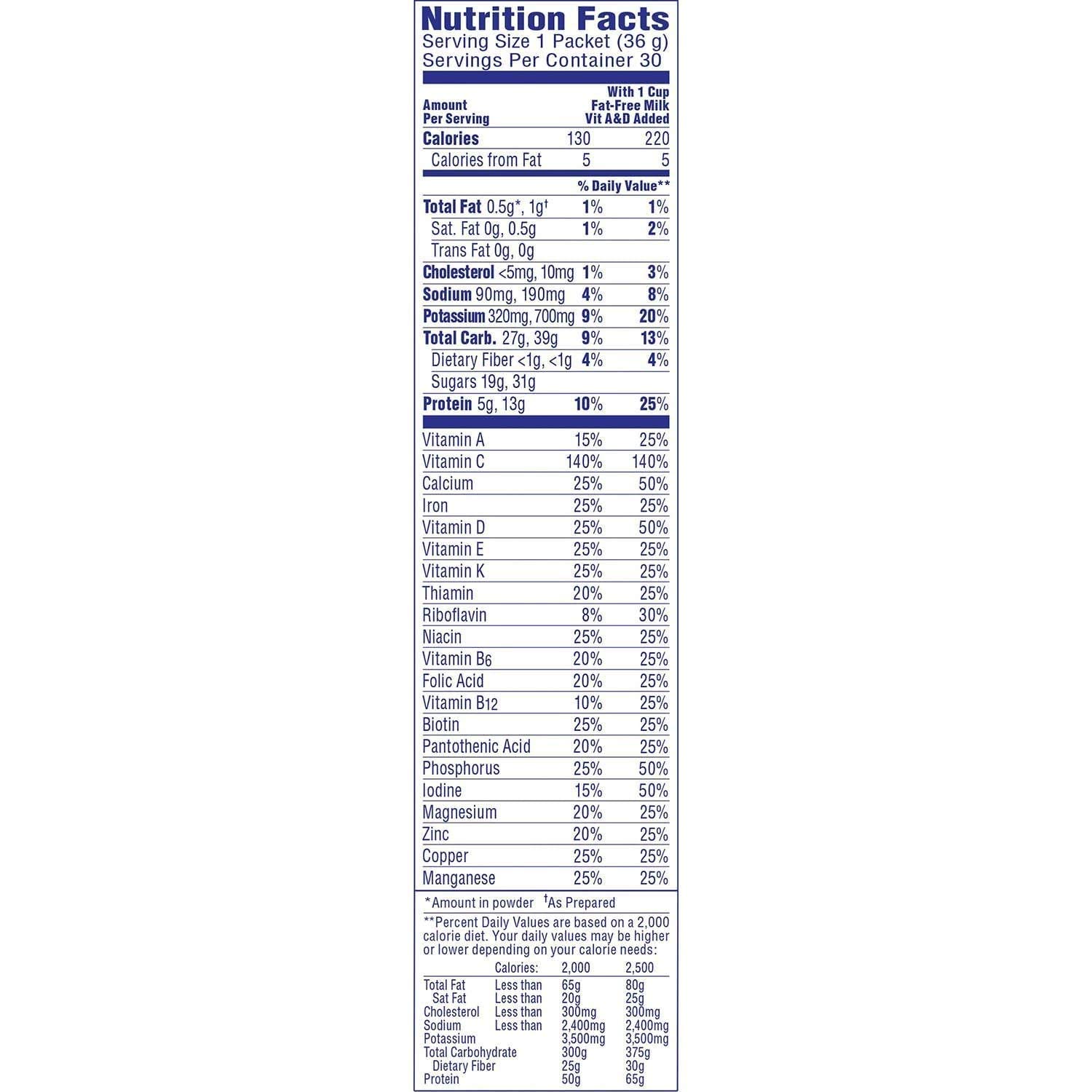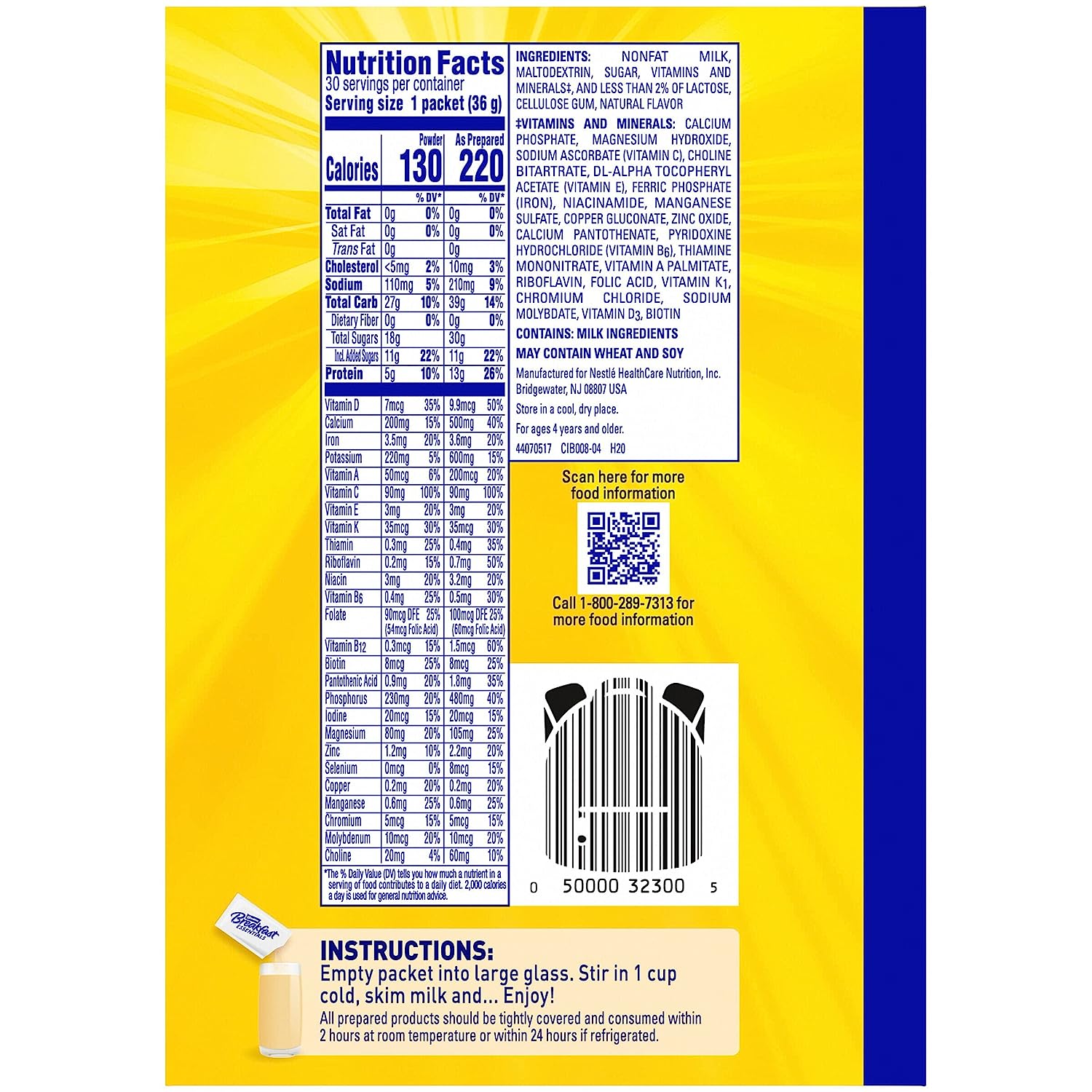 Treat your family to Carnation Breakfast Essentials Powder Drink Mix, which delivers balanced nutrition to start the day right. This nutritional drink is loaded with nutrition and flavor. A single serving mixed with one cup of skim milk provides 220 calories, 13 grams of protein, and 25% or more of the daily value for 21 essential vitamins and minerals, including calcium and vitamin D. Carnation Breakfast Essentials Classic French Vanilla Nutritional Drink mix is a powdered mix that makes a delicious nutritional drinks the whole family will love—just mix with 1 cup of skim milk. Start your day right with this vanilla drink mix that has 13 grams of protein and 220 calories per prepared serving. Carnation Breakfast Essentials Classic French Vanilla powder drink mix is a quick and convenient way for families to get the protein, vitamins and minerals they need to kick off their day. Each prepared serving has 21 vitamins and minerals, including three times the amount of Vitamin D as an eight fluid ounce glass of milk and three times as much calcium as a 5.3 ounce cup of Greek yogurt. The powdered nutrition drinks are great at home or on the go, for breakfast or between meals. The box includes ten 36 gram powder packets for enjoying breakfast shakes on the go. It's hard to balance a healthy lifestyle and a busy day. Carnation Breakfast Essentials nutrition shakes make it easy to start your day with good breakfast nutrition. Nutritionally appropriate for ages 4 years and older, including teens and adults.
