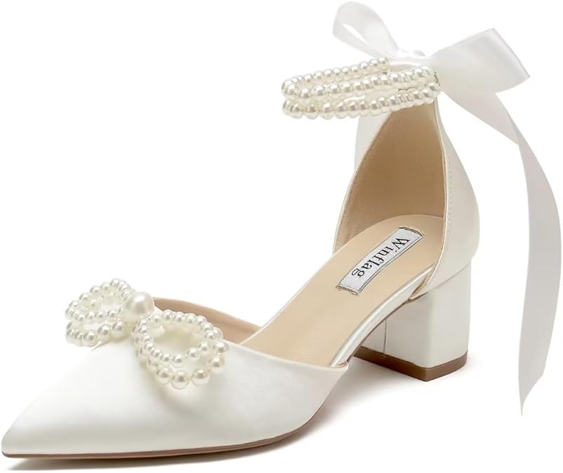 Block Heel Wedding Shoes for Bride Satin Pearl Bridal Heels Closed Toe Wedding Heels