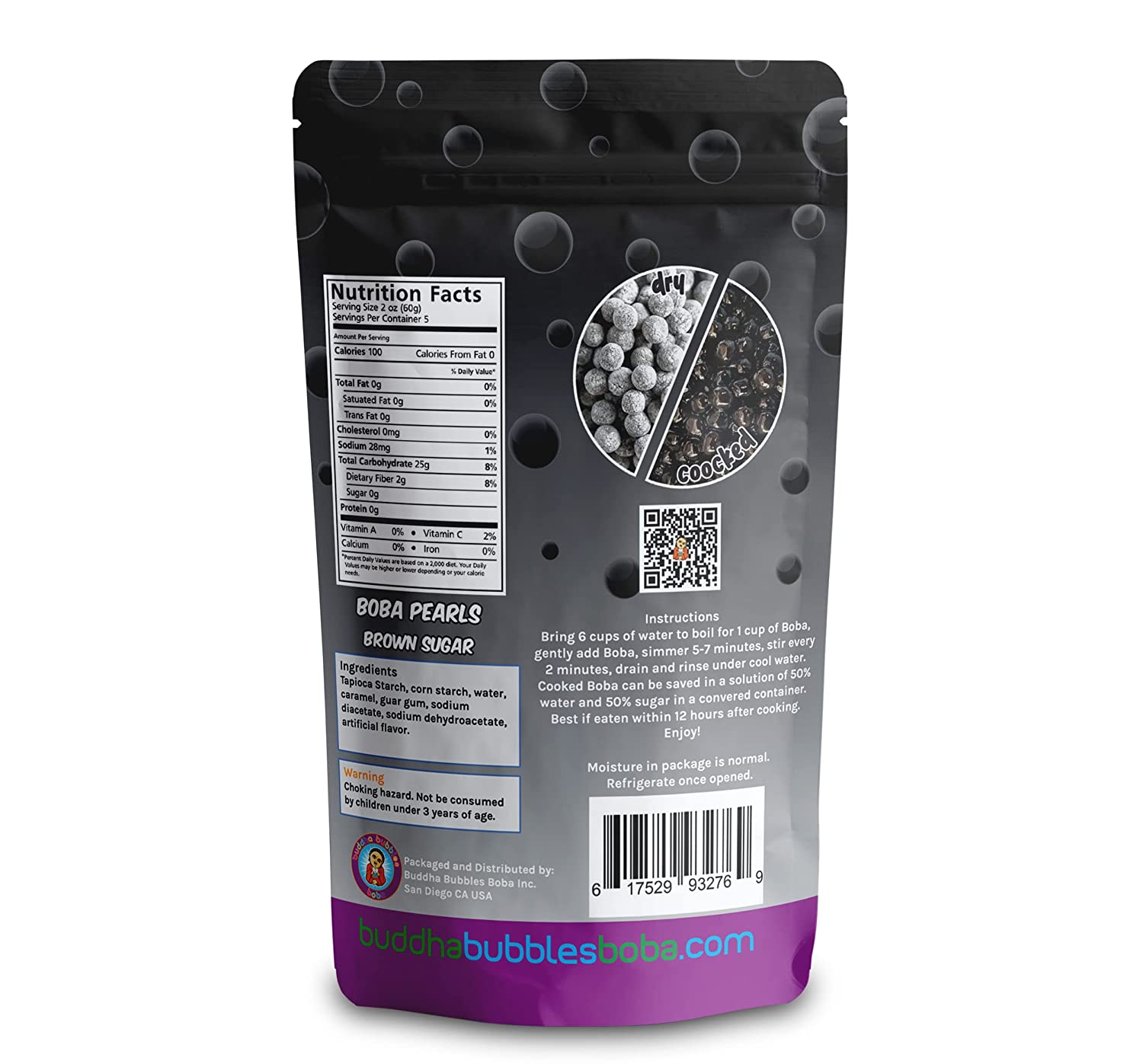 Black Boba Tapioca Pearls D.I.Y. Ready in 5 Minutes By Buddha Bubbles Boba (10 Ounces / 283 Grams) Boba Tea, also known as Boba or Bubble Tea is a Taiwanese, tea based drink which often contains tapioca, known as Boba, or Tapioca Pearls at the bottom of the cup. These Boba are sucked up through an extra-large straw and are chewy, kind of like a gummy bear. It is unclear exactly when or who invented Boba, but we do know where, Taichung Taiwan sometime in the 1980’s. Most Boba / Bubble tea recipes contain a tea base mixed with fruit or milk. Some popular flavors are: Honeydew Melon, Taro and Matcha Green Tea Latte. The Boba is served most often cold, sometimes hot, and blended like a smoothie or shaken like a cocktail. There are hundreds of variants of the drink, the most popular Boba / Bubble Tea drink is milk tea with tapioca pearls. There are also variations of Boba, mostly with the color being or dark brown. The Boba has a very mild sweet taste. Some shops also add flavored gelatin, also called jellies, to the bottom of the cup. The newest type of Boba are called “popping Boba”, pearl sized beads filled with fruit flavored syrup, that pop when you bite them. Boba shops are popping up all over the world. One Boba drink will set you back about $6.00 on average. Quality will vary from shop to shop, but at Buddha Bubbles Boba, we pride ourselves on not only the highest quality, but also the most amazing taste. So…have a Boba today and smile.