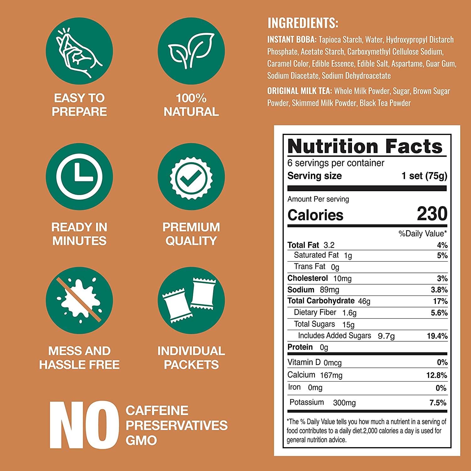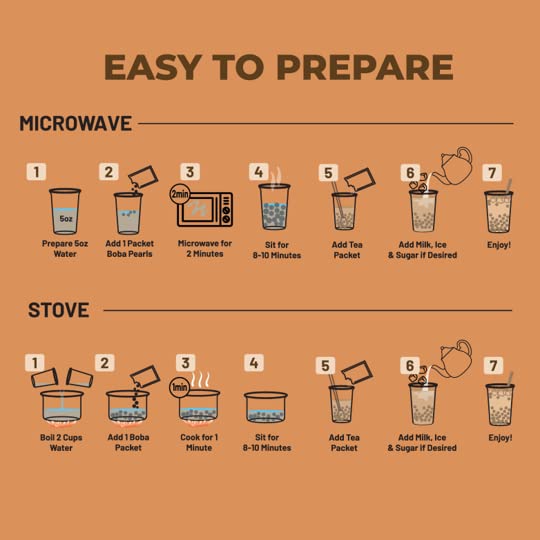 • CONVENIENT MICROWAVE METHOD - For a quick preparation, add 1 boba packet to 5 oz of water and microwave for 2 minutes. Allow it to sit and cool for 8-10 minutes. Then, simply add 1 tea packet, along with milk, ice, and sugar if desired.