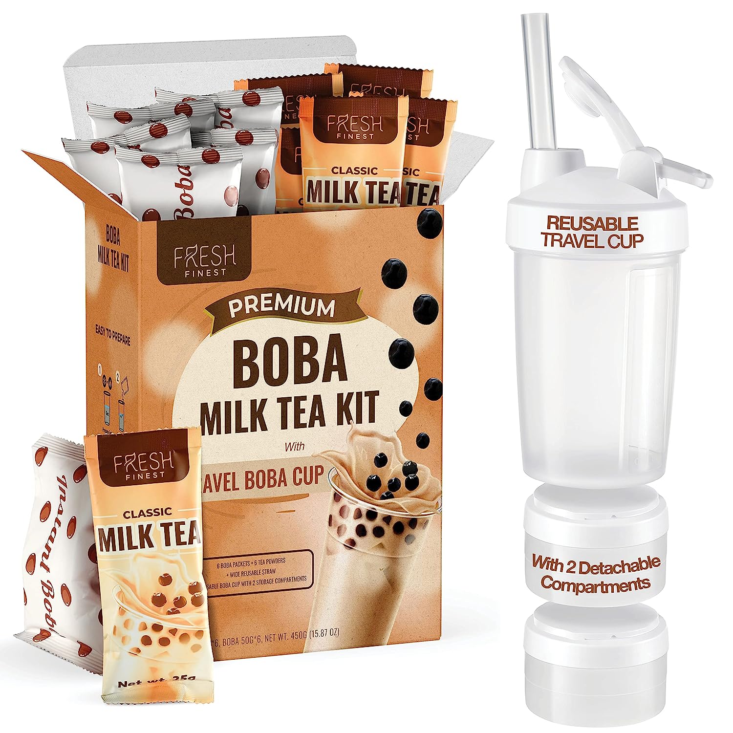 Fresh Finest Instant Boba Tea Kit with Tapioca Pearls + Reusable Boba Cup & Straw (6 Servings) Bubble Tea Kit - 6 Classic Milk Tea Packets & 6 Bubble Tea Pearls Packets - Ideal Gift For All Occasions