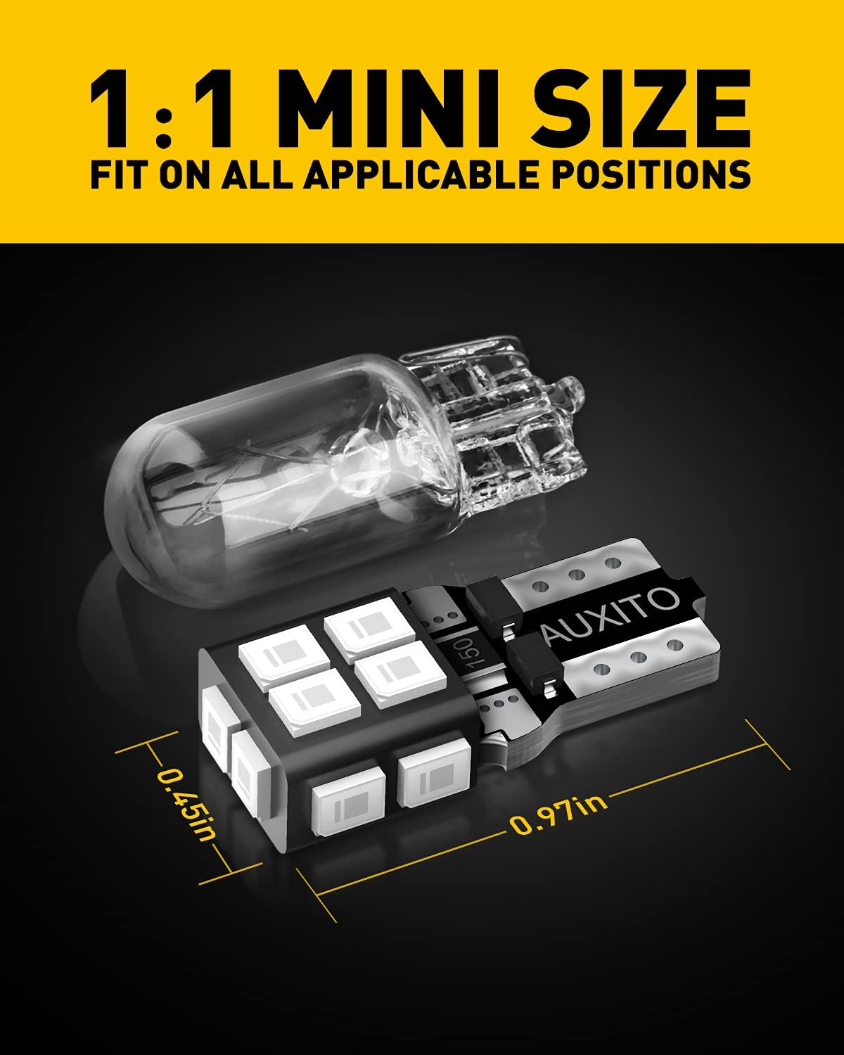 • 1:1 MINI SIZE: Almost the same size like stock 194 halogen bulbs. Thick plug design ensures the 2825 led bulbs fit tightly fir all T10 wedge type, compatible with 194, 2825, 168, 161, 175, 174, W5W, etc
