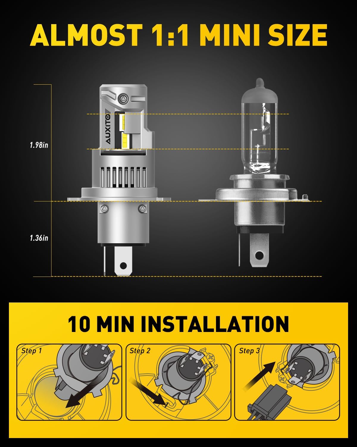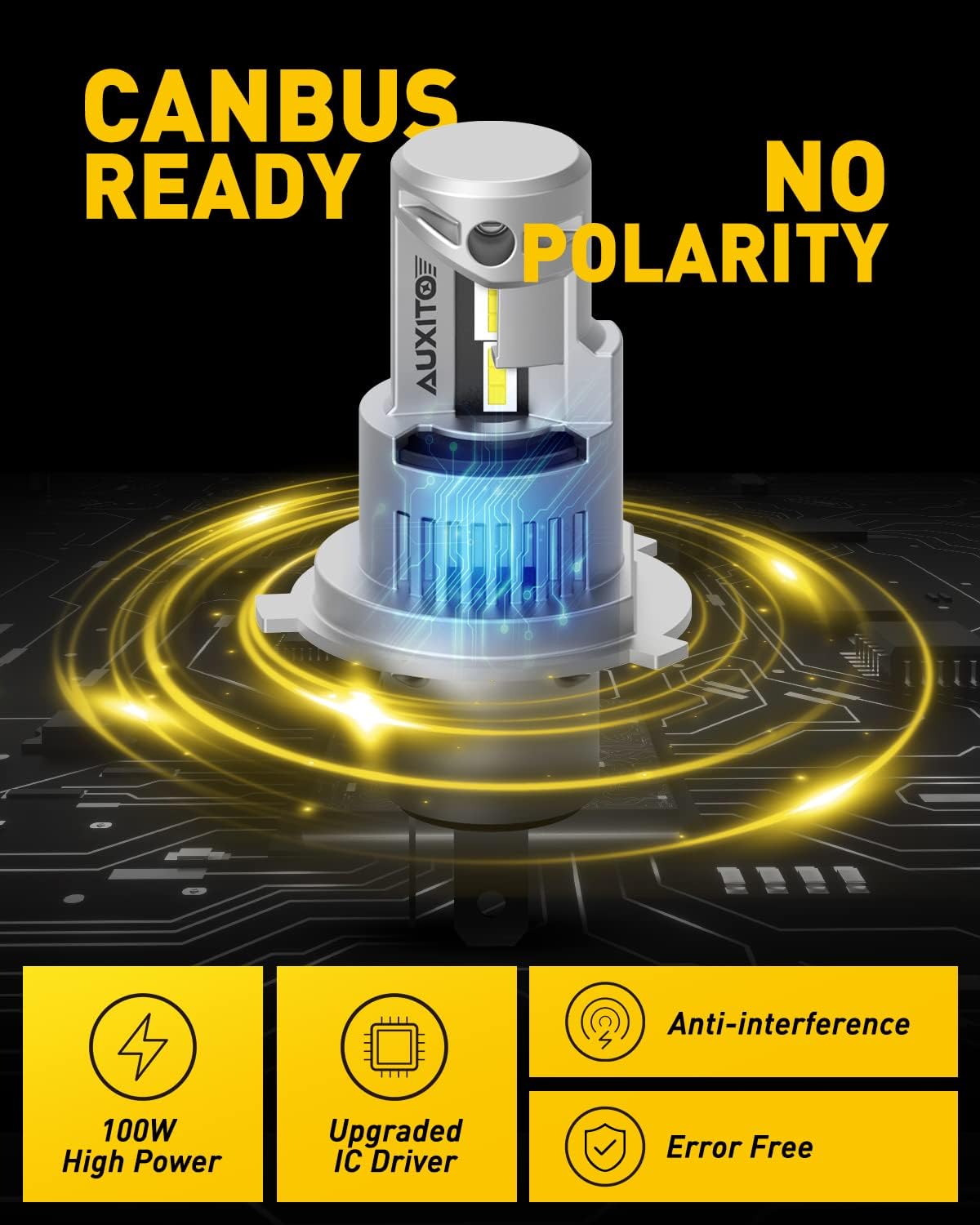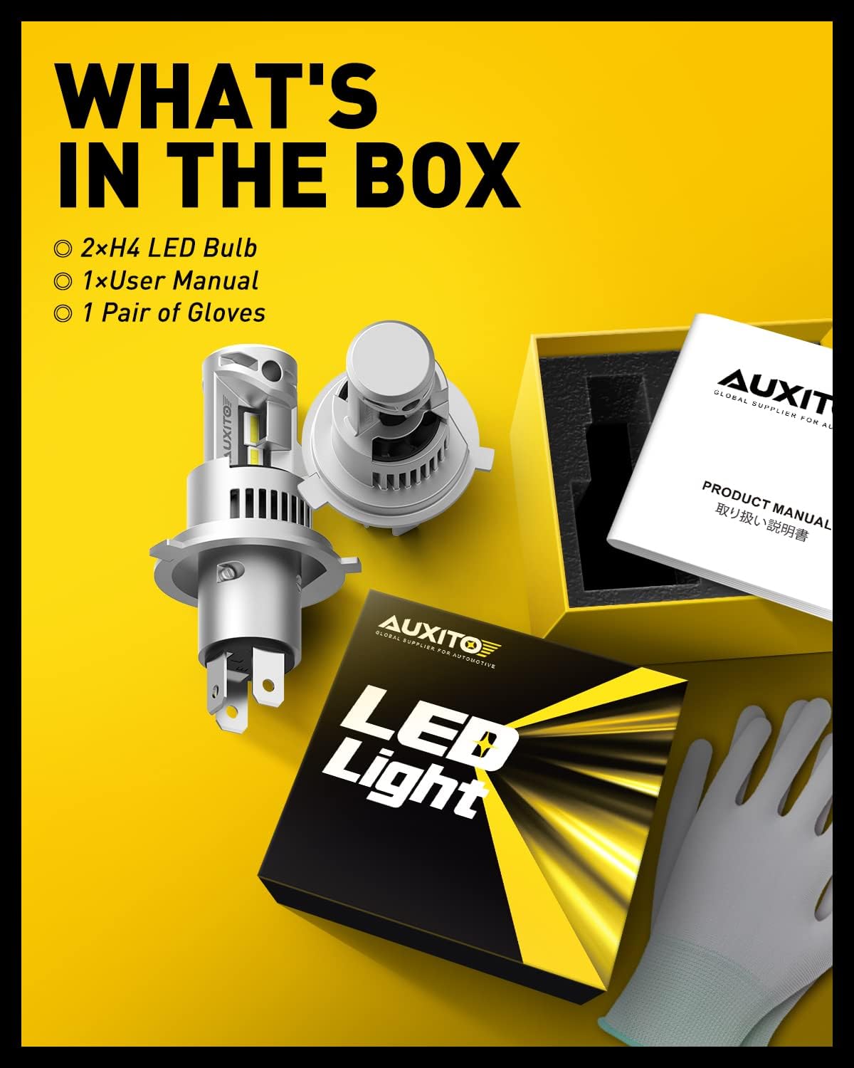 • [ Great Brightness Improved] AUXITO New upgraded H4 LED High/Low beam LED bulbs are 100W per set, providing up to 600% brighter than OEM halogen 9003 bulbs. 6000K cool white and 20,000LM bring you a clear vision when driving