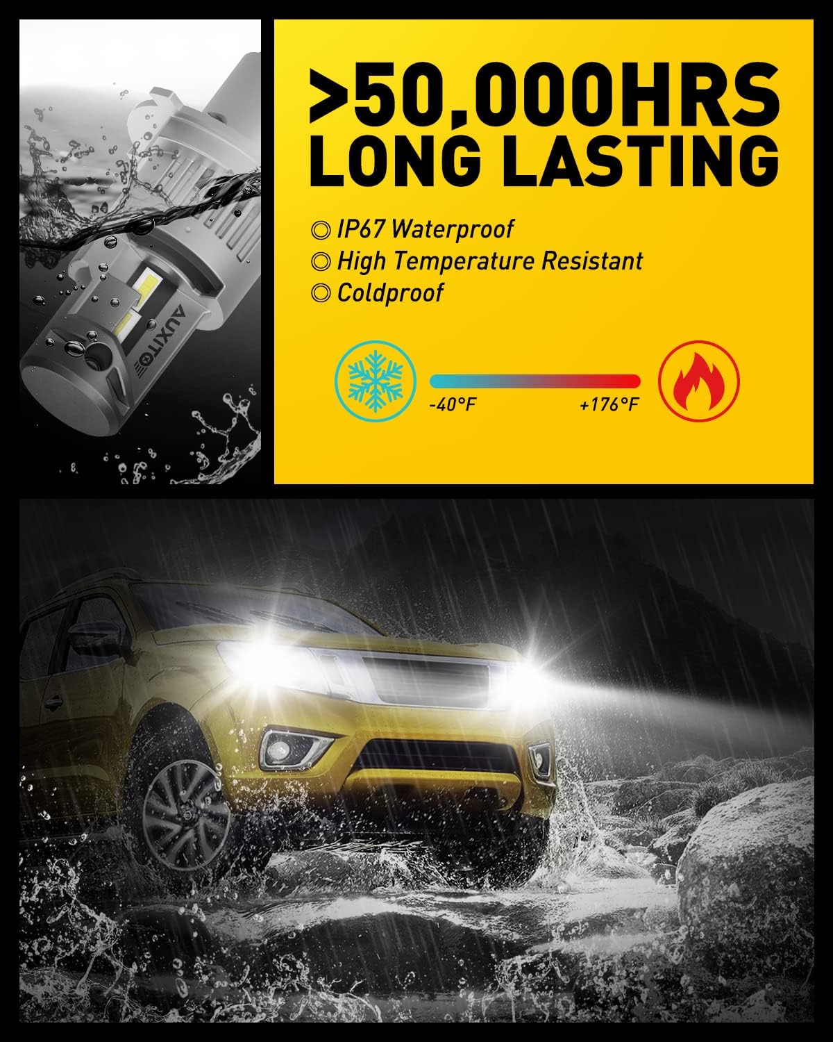 • [ Triple Heat Dissipation Design] The all-in-one compact design with full body aluminum material, 12,000 RPM cooling fan and 90 degree turning thermal fluid. These three heat dissipation designs make the lifespan of AUXITO 9003 LED bulbs exceed 50,000hrs
