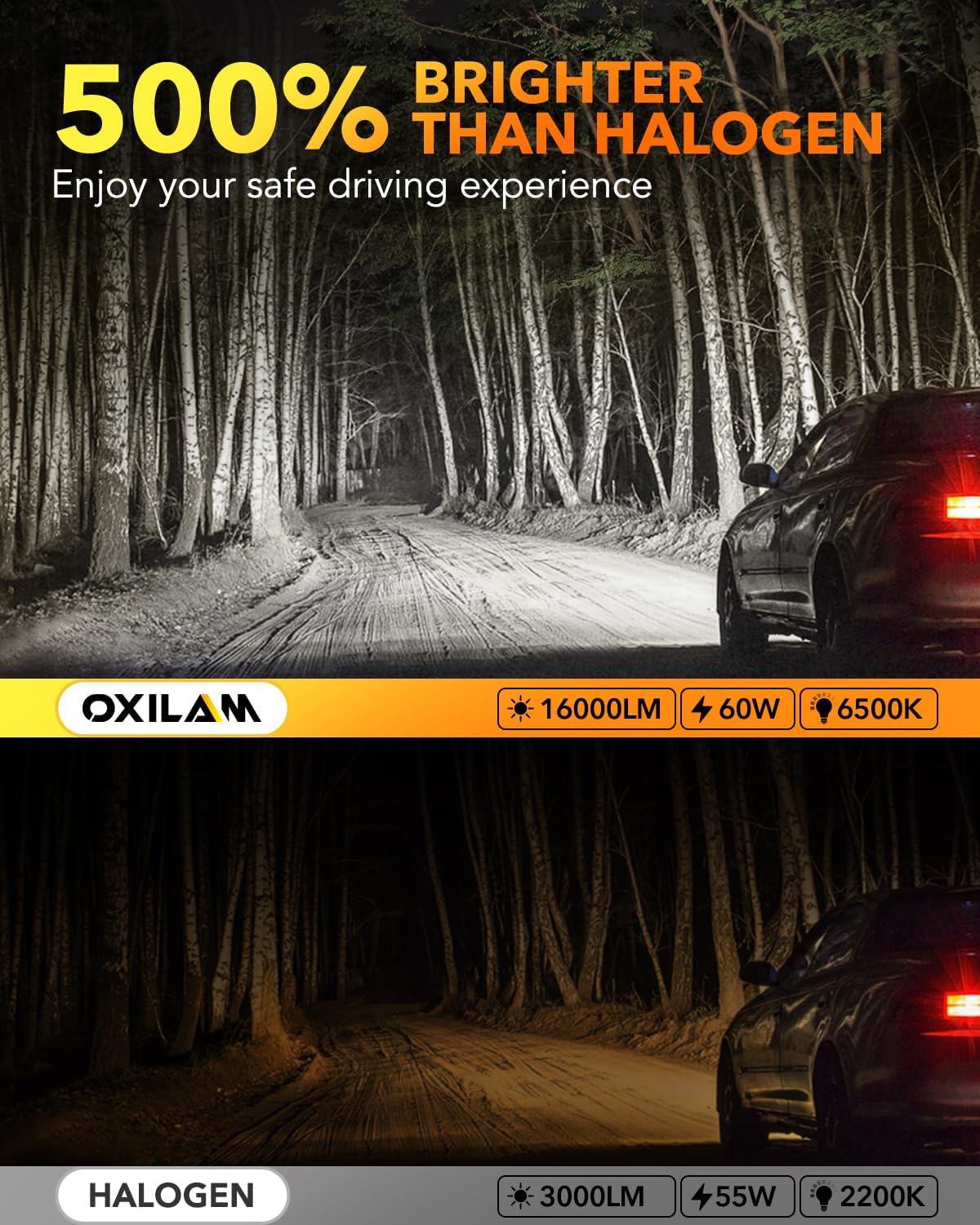 • 【Safest Beam Pattern】OXILAM H11 led has the same perfect beam pattern as halogen bulbs, with a clear cutoff line that won't blind oncoming traffic. The 0.03-inch ultra-thin copper plate design provides 360 degrees of illumination with no dark spots, allowing for a wider and further view at night.
