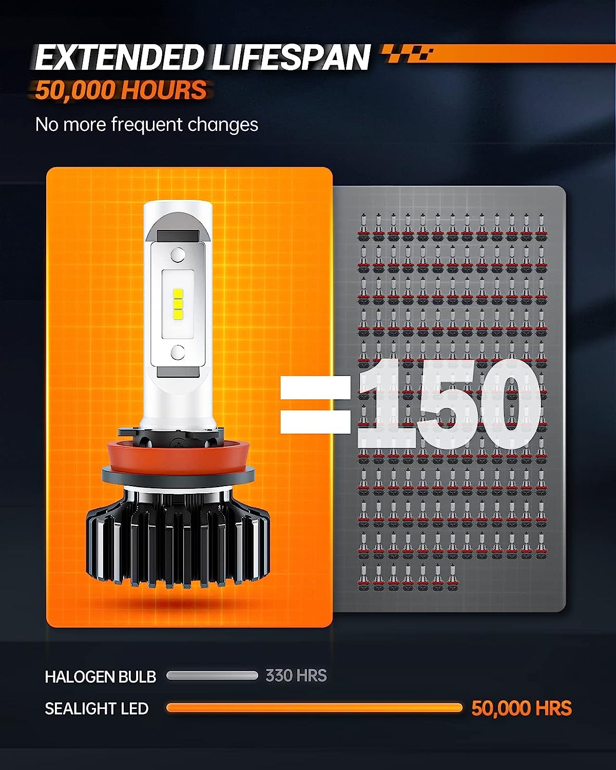 • 20 Year Lifetime: SEALIGHT H11 led light bulbs Lifetime is 60 times longer than the stock lamp because of utilizes an advanced heat sink measuring just 0.72 inches and features a driver for increased performance. Also, H8/H9/H11 LED bulb has been rigorously tested for durability and Waterproof