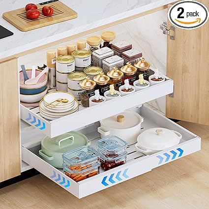 2 Pack Expandable Pull Out Cabinet Organizer Adhesive, Peel And Stick Slide Out Drawers for Kitchen Cabinets, Cabinet Pull Out Shelves For Kitchen Pantry Organization Adjustable Width 12.6"-21"
