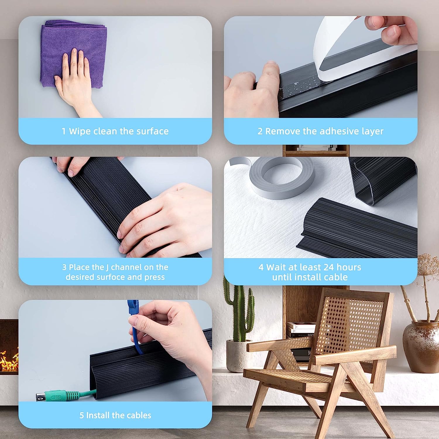 • Hassle-free 5-Minute Tape Installation: Installation is a breeze with our premium 196" adhesive PE tape, no drilling or nailing needed. The adhesive tape is twice the length of the J Channel Raceway Cable Kit and quite strong. For greater adherence and durability, we recommend that stick 2 rows of tape, and please wait for 24 hours later and put cables inside the cable tray.