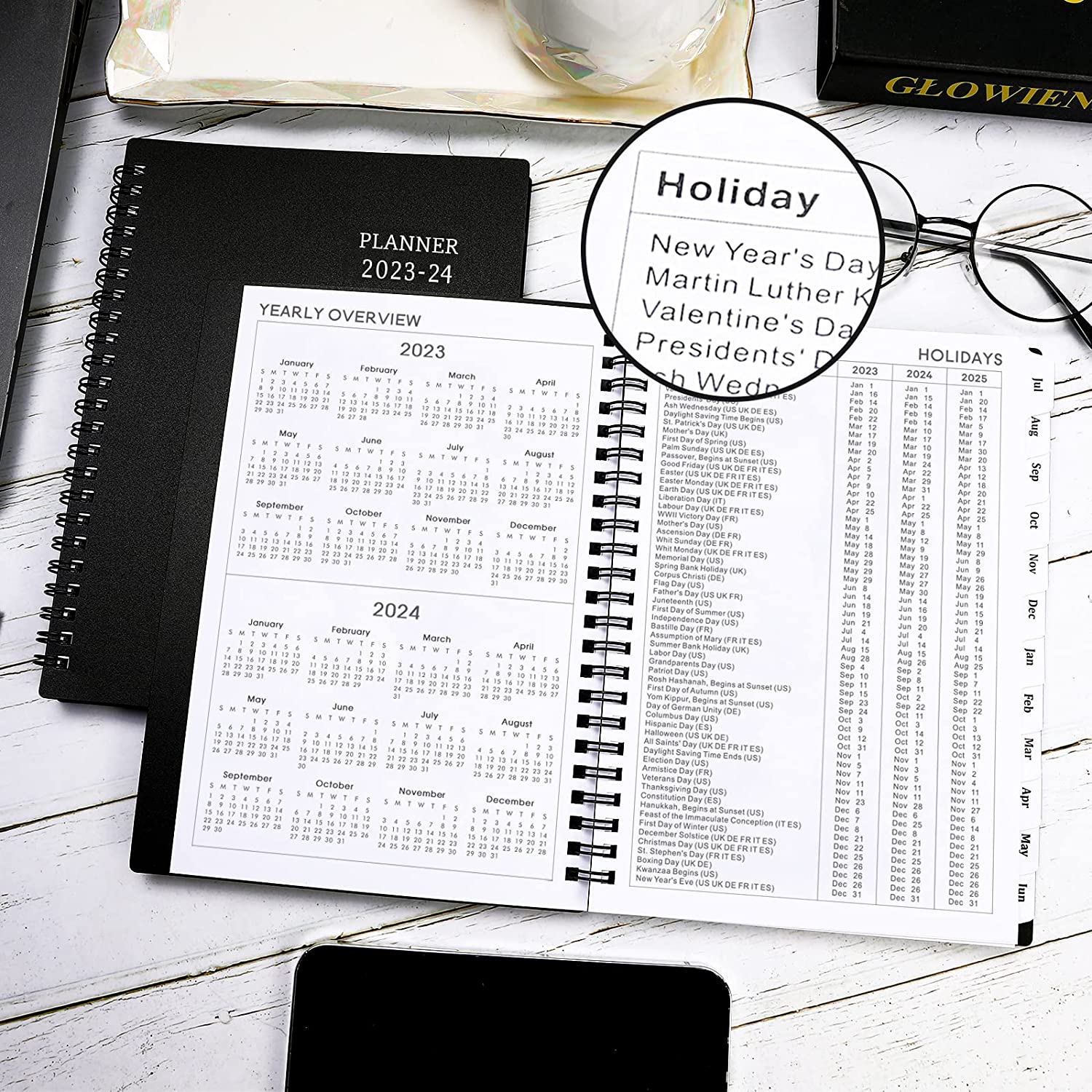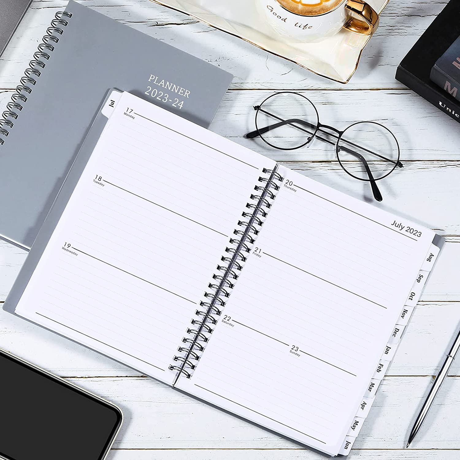 • ✔ OVERVIEW - This 2023-2024 planner is from Jul. 2023 - Jun. 2024, 6.25" x 8.3" (A5 Size), featuring 12 months of monthly and weekly pages for easy year-round planning. Premium quality covers and twin-wire binding, metal lay-flat spiral binding, excellent texture, with classic and stylish combinations of appearance.