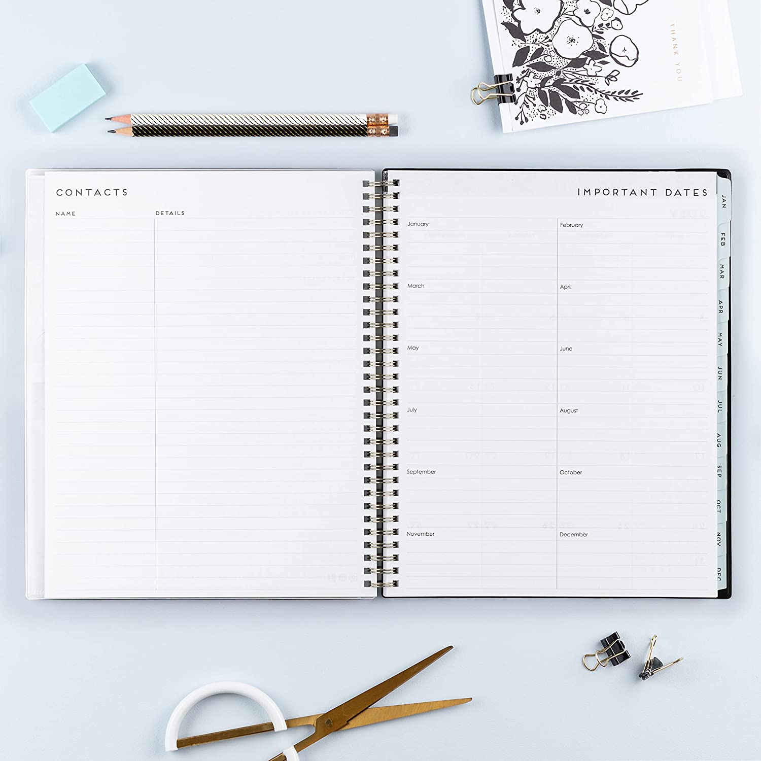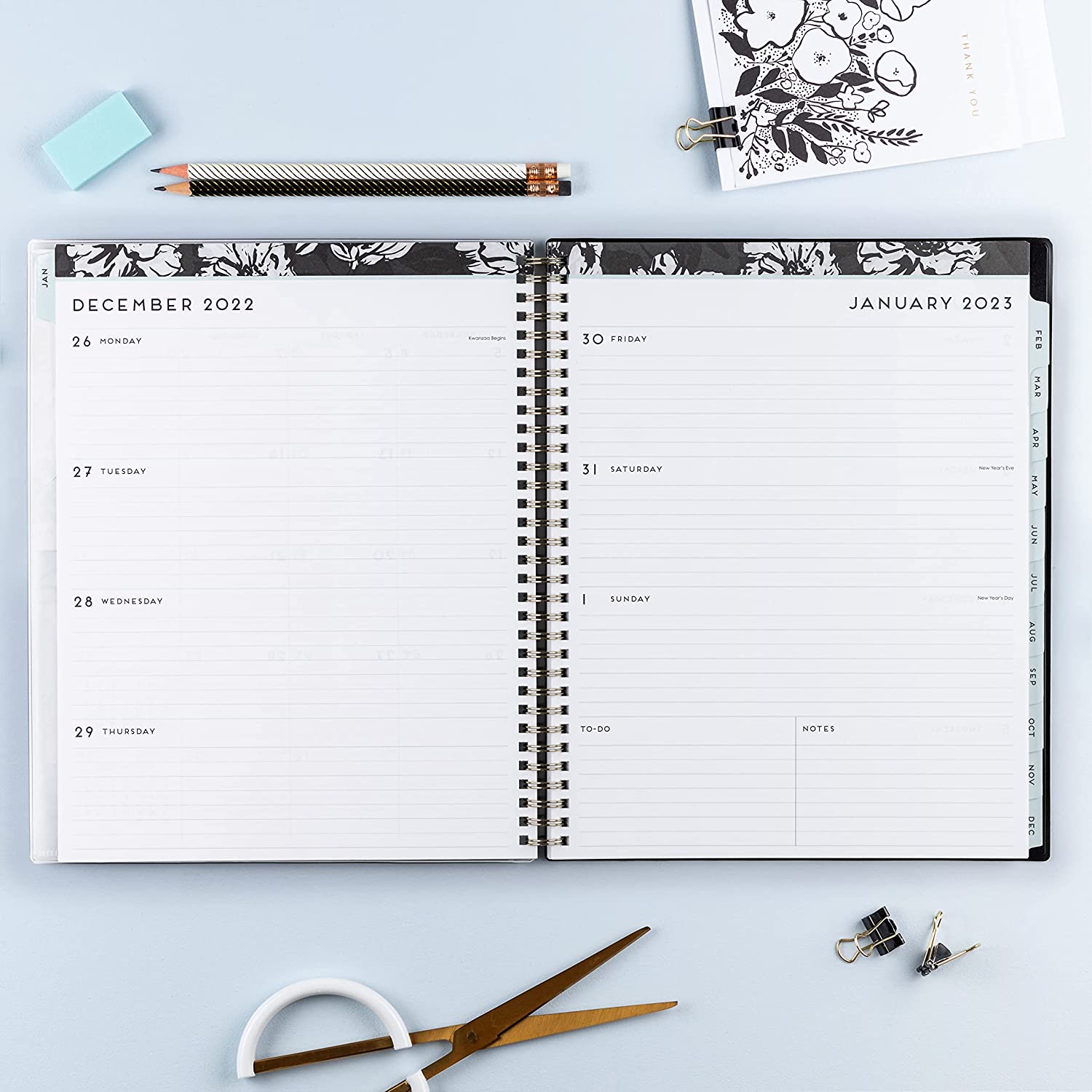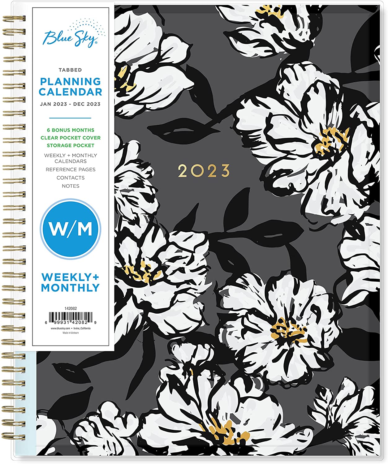 Plan your year in style with the beautiful florals and bold colors of the 2023 calendar year Baccara Dark collection. This stylish CYO (create your own) cover planner will keep you organized everywhere you go. Add in your favorite photos, sentiments, notes or memories to the clear cover pocket, and stay organized with dated monthly pages inside for easy scheduling. Simple page designs add a touch of sophistication and offer plenty of room for all of your important information. Designed with practicality and ease of use in mind, this floral agenda's monthly calendar tabs allow for easy access to each month’s plans while weekly views offer ample writing space for detailing each day. High quality white paper provides clean writing space for jotting down your appointments, to-dos and reminders. Use this dated planner to keep track of your appointments, and to write down notes and ideas in one place. Durable coated tabbed dividers are long lasting and make accessing information a breeze. Premium quality covers and twin-wire binding provide reliable durability for daily use. Stay on track throughout the year with this 8.5 x 11 planner dated January 2023 - December 2023. Mix and match with other Baccara Dark Collection planning products from Blue Sky to organize your daily life.