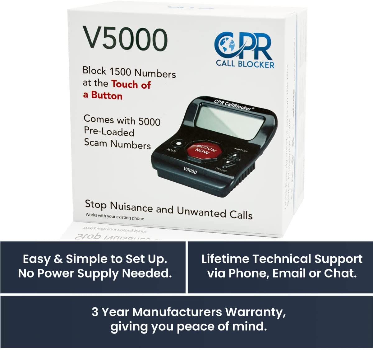 Call Blocker for Landline Phones - Say no more to robocalls, political calls, scam calls, unwanted calls, nuisance calls, telemarketing calls: block all at the touch of a button! The CPR V100K Call Blocker features a 3 inch caller display screen, large "Block Now" Button, 110,000 Number capacity and has the ability to block unwanted callers from cordless DECT extension handsets by pressing #2. V100K Main Features: Easy to use controls: With CPR Call Blocker easy to use control buttons you can view the callers number on its large 3 inch display and view the blocked number list as well as see how many times that blocked number has tried to recall. If required blocked numbers can be easily removed from the block list using the delete button. Built in Number List: The CPR Call Blocker is pre-programmed with more than 100,000 numbers which are 'deemed' As known nuisance callers. Companies which are selling by phone, using overseas call centers and automated sales lists are all pre-programmed which will minimize the sales calls you receive almost immediately. Block Now function: The ‘Block Now’ button is located on the top of the unit. At the touch of a button the unwanted caller’s number is logged into the unit’s memory, the call will hang up and the number blocked Permanently. This feature allows you to block up to 10,000 unwanted callers as they are calling you. #2 Blocking function: Block a number by entering #2 on any DECT handset connected to the telephone base. Manual entry: Manually enter or remove numbers to/from the blocking list Compatibility: Compatible will all major US line providers including AT&T, Comcast, Coma, Verizon, Century Link, Frontier etc. Caller ID services from your network provider is required for this product to work.