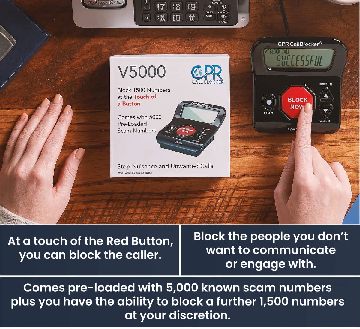 Say No More To Robocalls Political Calls Scam Calls Unwanted Calls Nuisance Calls Telemarketing Calls Block All At The Touch Of A Button! The CPR V5000 Call Blocker features a 3 Inch caller display screen large "Block Now" button 6500 number capacity and has the ability to block unwanted callers from Cordless DECT extension handsets by pressing #2 V5000 Main Features Easy To Use Controls With CPR Call Blocker's easy to use control buttons you can view the callers number on its large 3 Inch display and view the blocked number list as well as see how many times that Blocked number has tried to recall If required blocked numbers can be easily removed from the block list using the delete button Built in Number List The CPR Call Blocker is pre-programmed with more than 5000 numbers which are 'deemed' as known nuisance callers Companies which are selling by phone using overseas call centres and automated sales lists are all pre-programmed which will minimise the sales calls you receive almost immediately Block Now Function The 'Block Now' button is located on the top of the unit At the touch of a button the unwanted caller's number is logged into the unit's memory the call will hang up and the number blocked permanently This feature allows you to block up to 1500 unwanted callers as they are calling you #2 Blocking Function Block a number by entering #2 on any DECT handset connected to the telephone base Manual Entry Manually enter or remove numbers to/from the Blocking list Compatibility Compatible will all major US line providers including AT&T Comcast Ooma Verizon Century Link Frontier etc CALLER ID SERVICES FROM YOUR NETWORK PROVIDER IS REQUIRED FOR THIS PRODUCT TO WORK