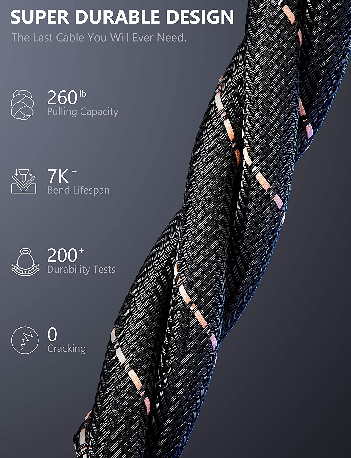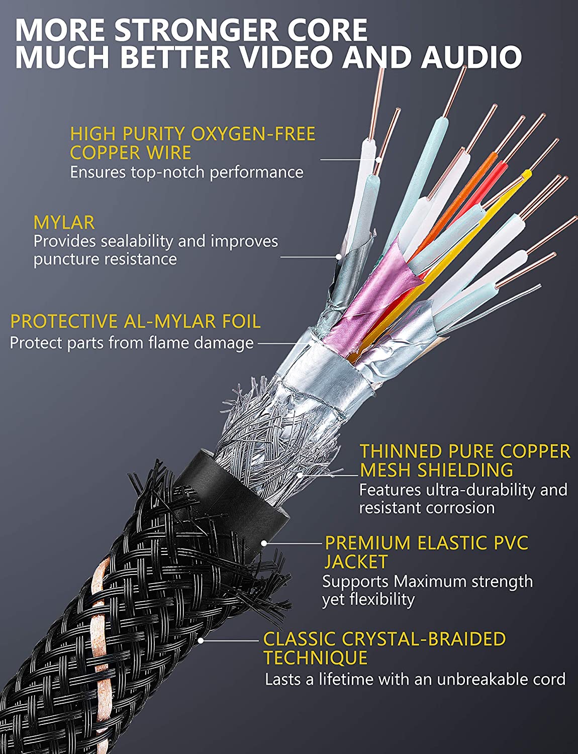 • STRONG BUILT QUALITY: This HDMI to HDMI cable 8ft well constructed with premium material, features two gold-plated contacts, pure metal zinc alloy housing, extra-strength braided exterior, triple shielding jacket, secure-fit design, and 28AWG oxygen-free copper wiring, every single detail we made uniquely is to ensure to present the perfect experience, never sacrifice frame rate or resolution again, keeping you in that picturesque moment or the action of the game for now, and into the future.
