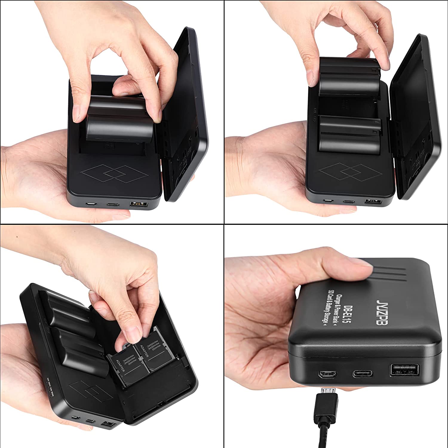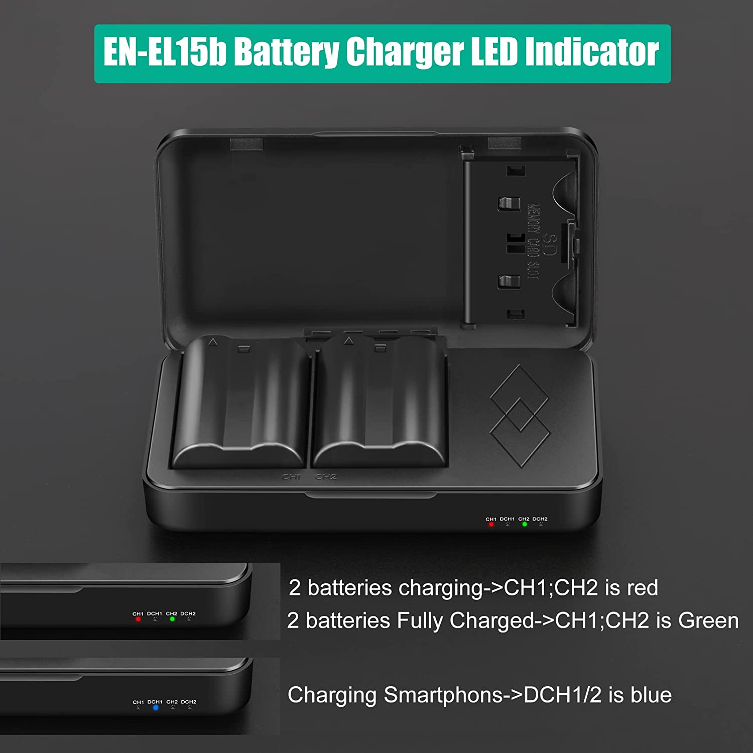 • 📸【Multi-Function EN-EL15 Battery Charger】Upgraded Four-in-one charger case design. 1,) charge Nikon EN-EL15B batteries. 2,) as a storage case to store two pack EN-EL15 batteries. 3,) store two SD cards. 4,) what's more, have a phone power bank function, give you a portable charger solution for your mobilephone.(Note: The portable charger function need one/two EN-EL15B battery inside as a power source, only fit for mobilephone.)