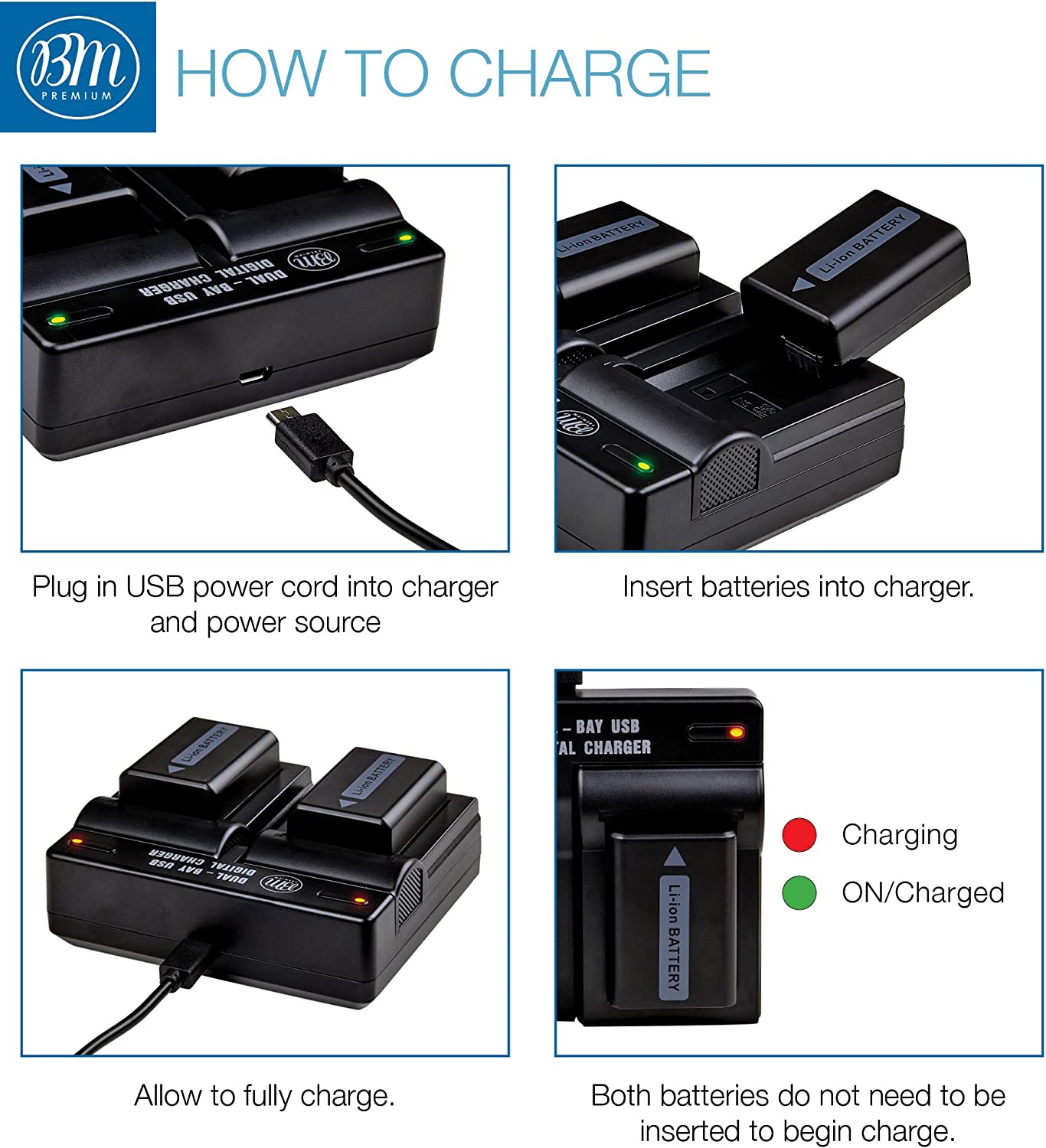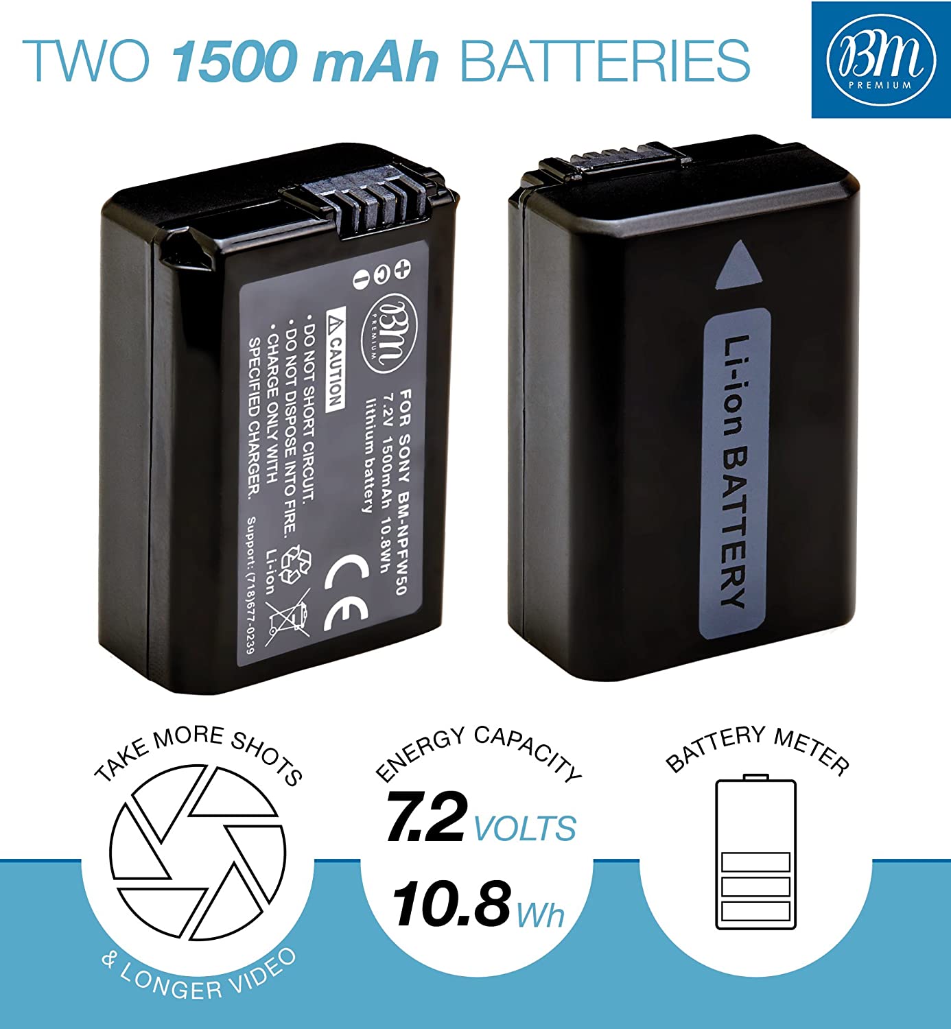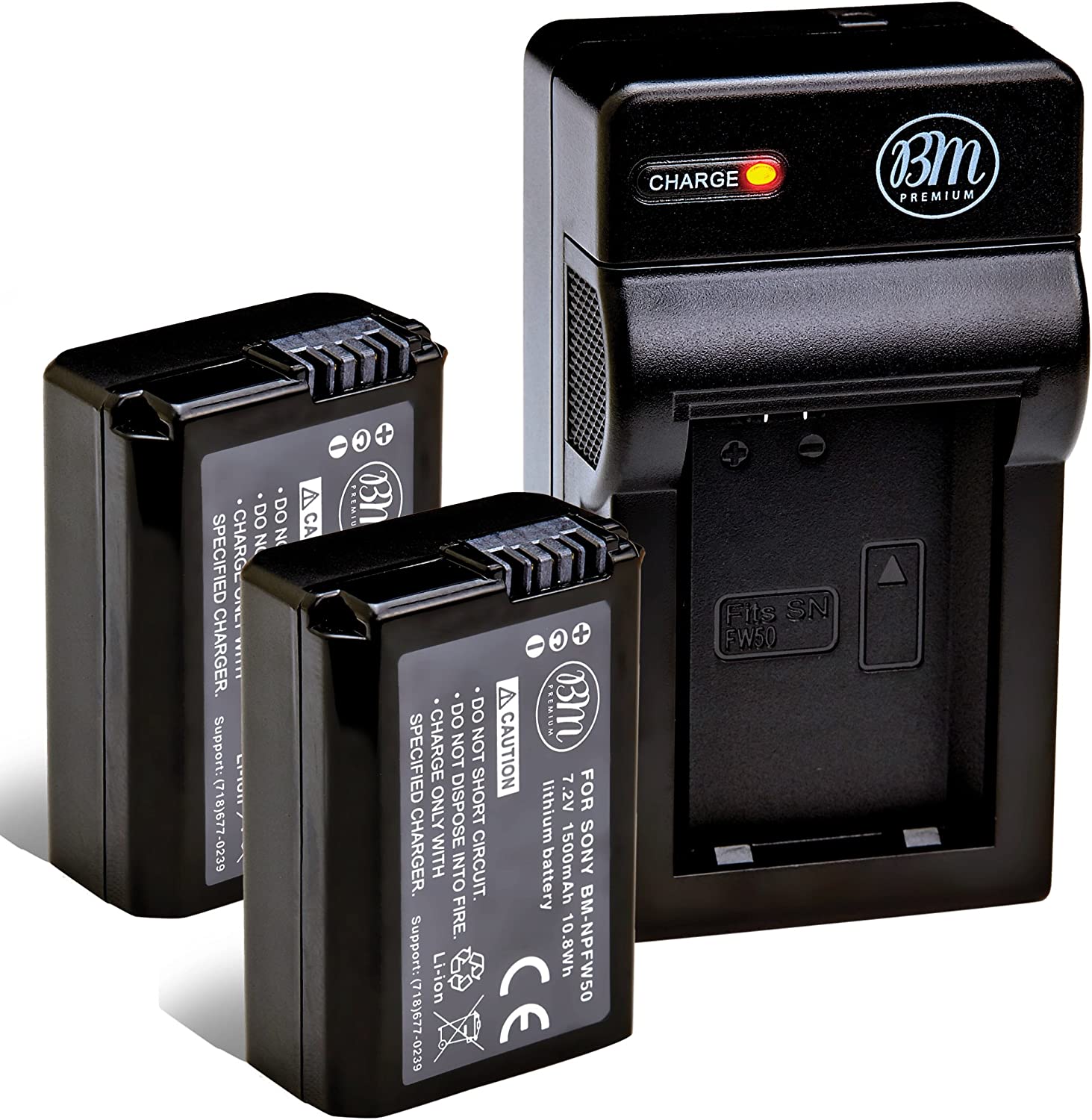 2 NP-FW50 Batteries and Charger for Sony ZV-E10, A6100, A6400, DSC-RX10 IV, DSC-RX10 III, DSCRX10 II, DSC-RX10, Alpha 7, Alpha 7R, a7, a7R, A7s, A7s II, a3000, a5000, a6000, a6300, a6500 By BM Premium