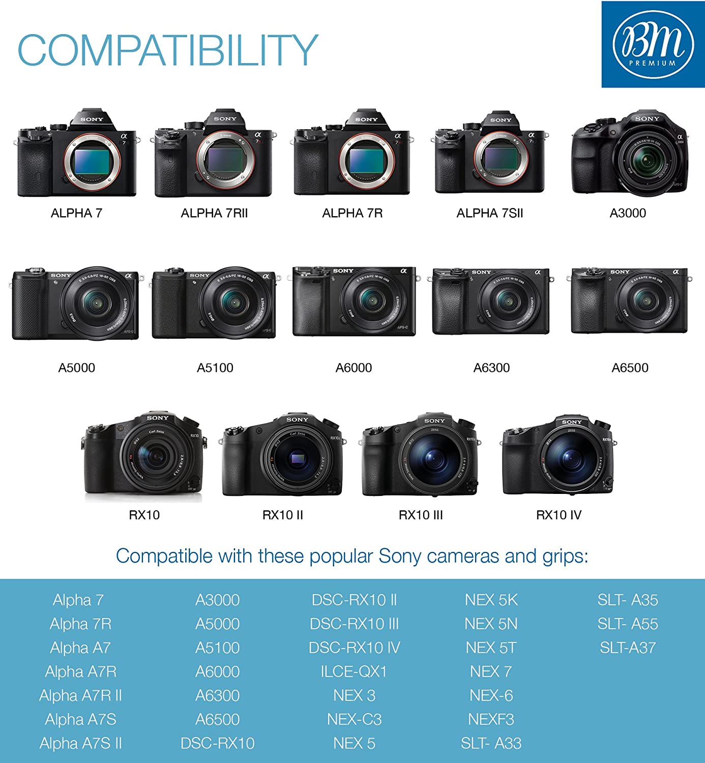 • Compatibility - NPFW50 NPF-W50 Li-ion Battery for Sony Alpha 7, Alpha 7R, Alpha A7, Alpha A7R, Alpha A7R II, Alpha A7S, Alpha A7S II, A3000, A5000, A5100, A6000, A6100, A6300, A6400, A6500, DSC-RX10, DSC-RX10 II, DSC-RX10 III, DSC-RX10 IV, ILCE-QX1, NEX 3, NEX-C3, NEX 5, NEX 5K, NEX 5N, NEX 5T, NEX 7, NEX-6, NEXF3, SLT- A33, SLT- A35, SLT- A55, SLT-A37, ZV-E10 Digital Cameras
