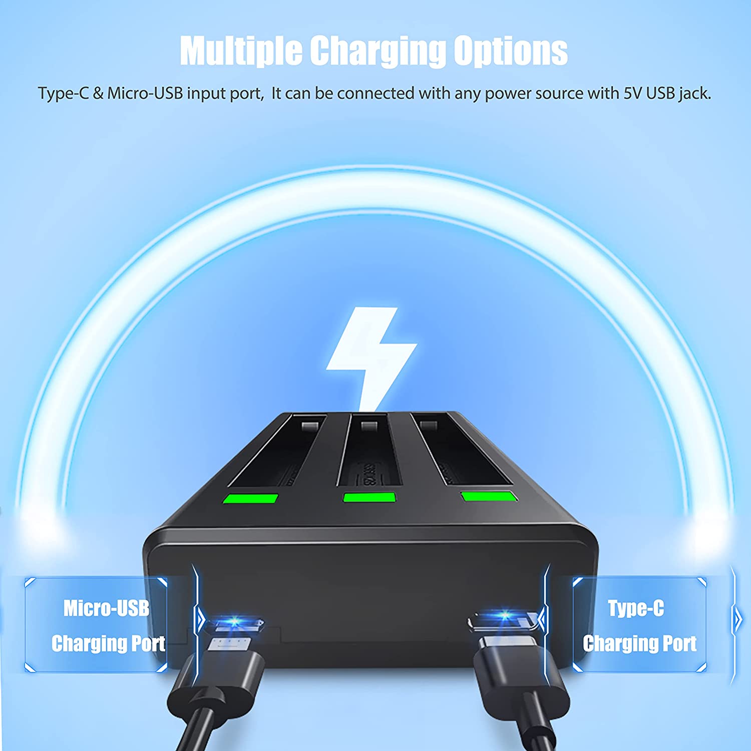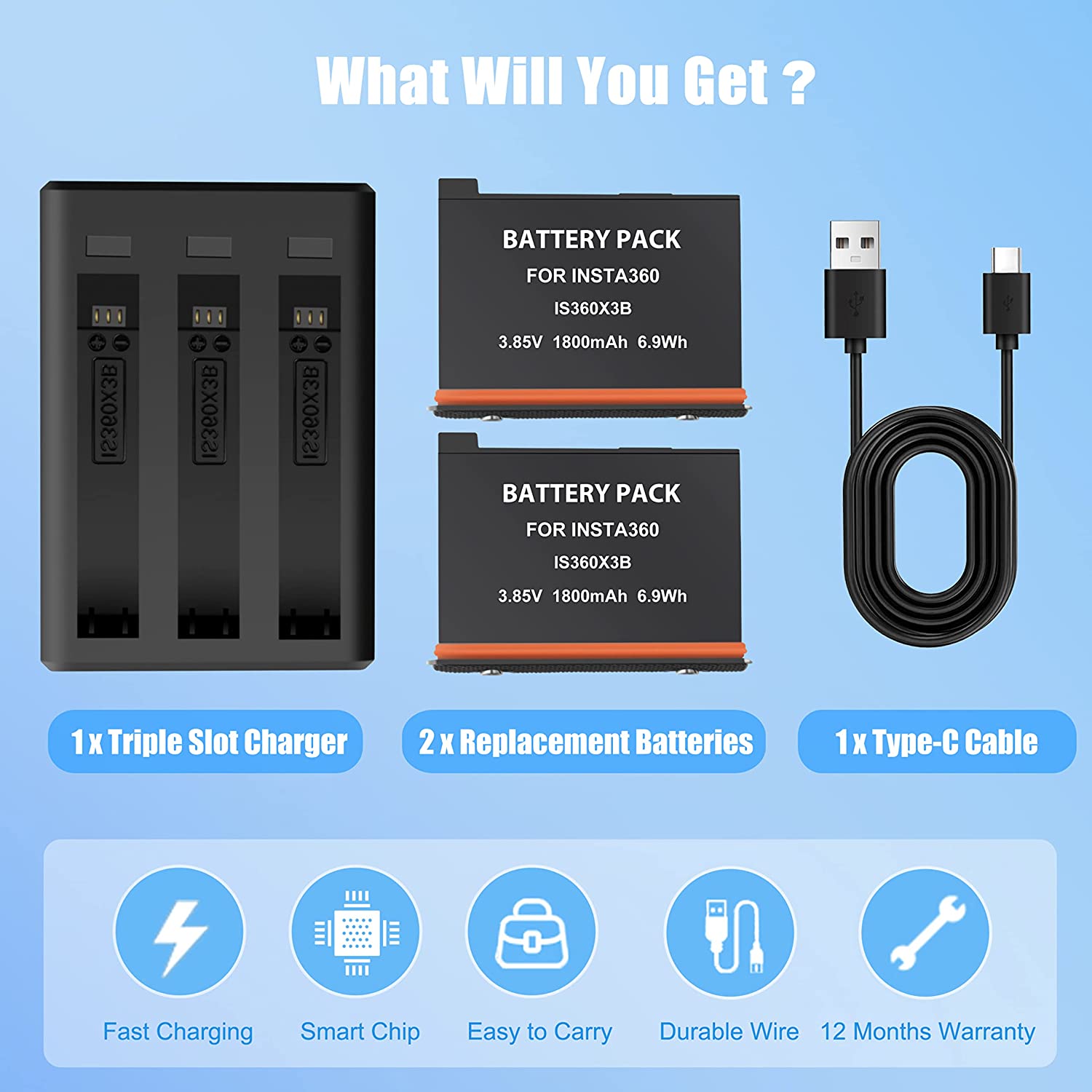 • 📷【Fully Compatible】DONGNI Insta 360 One X3 Battery and 3 Channels Battery Charger are designed for Insta360 ONE X3 Camera, 100% Compatible with Insta360 ONE X3 Camera. Package including 2-pack 1800mAh batteries + 3-Channel USB Quick Charger + Type-C Cord.