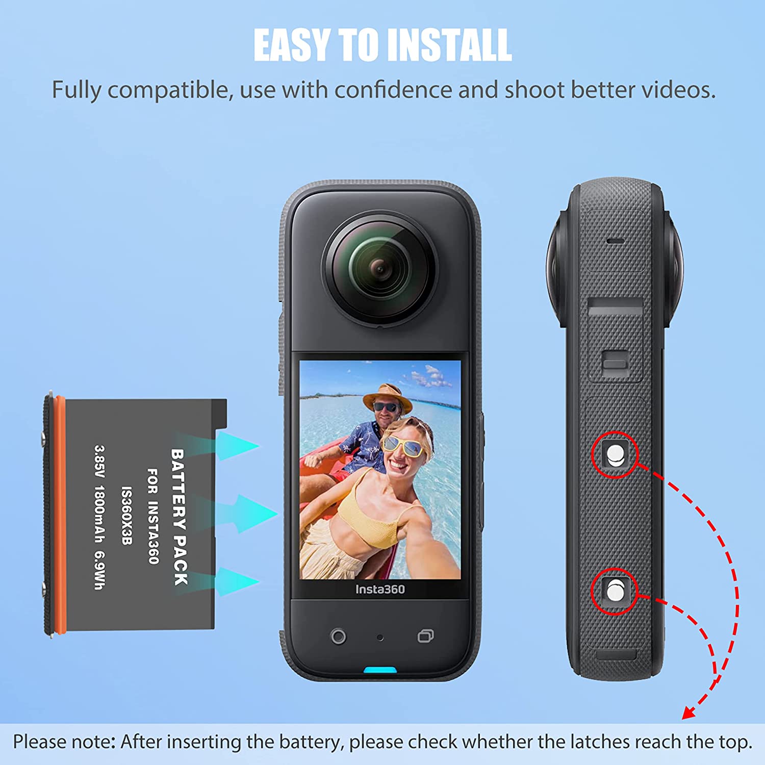 • 📷【More Capacity, More Photos】 2-Pack 1800mAh high quality and capacity rechargeable batteries boost your Insta360 ONE X3 360 Camera running time, no memory effect. Provides uninterrupted performance for your Insta360 ONE X3 Camera, ensure Record every memorable moment.