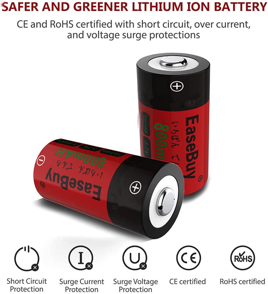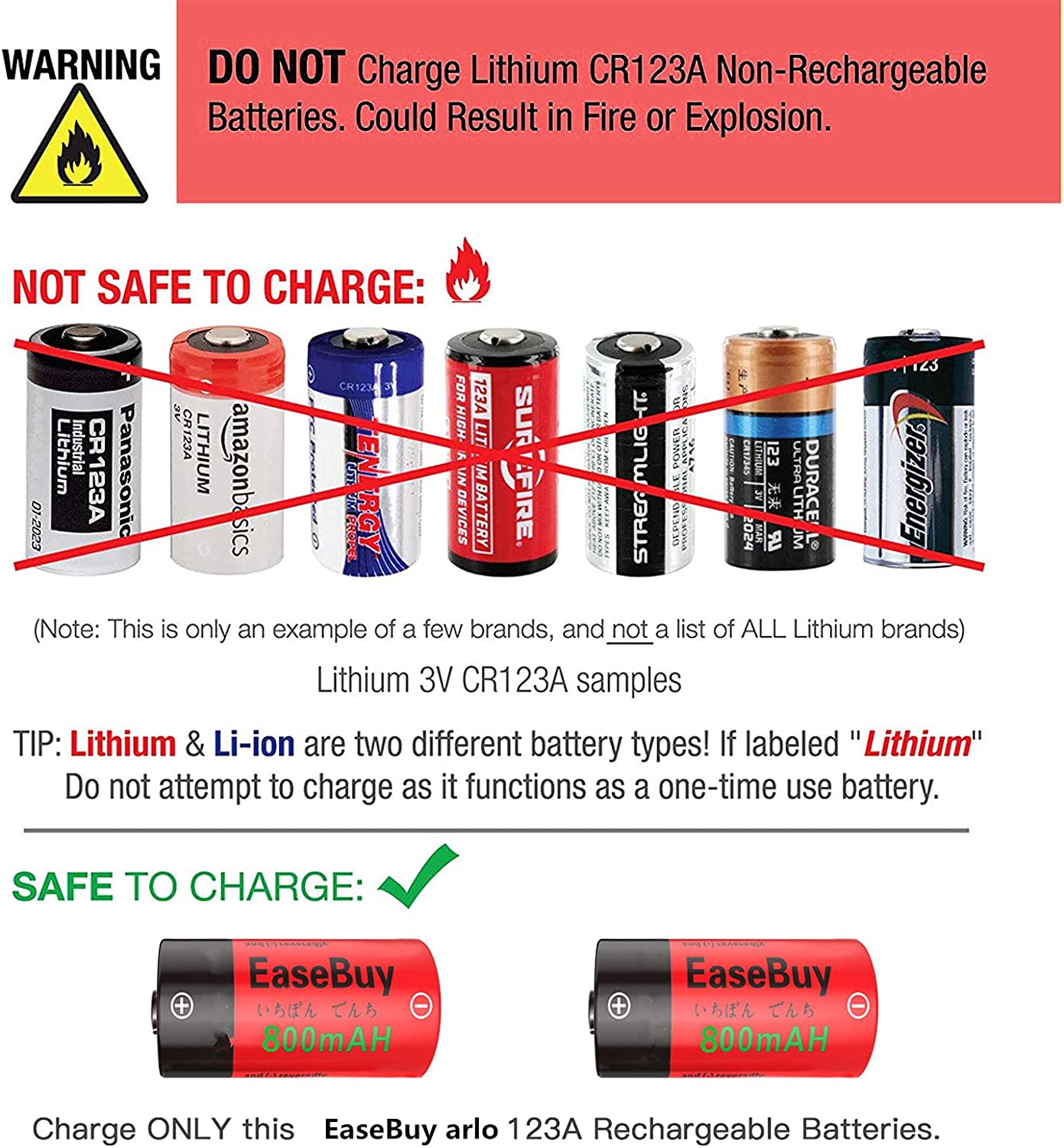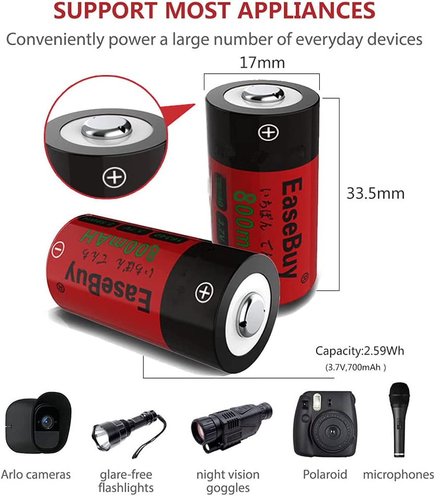 • MULTI COMPATIBILITY: Rechargeable batteries with Charger for Arlo Cameras, August Pro Wifi, CR123A LED flashlights, video game consoles, appliances, medical equipment, calculators, memory backup and others electronic devices. 3.7V NiMH 800mAh High Capacity provides the best run time possible Ideal for rechargeable Arlo batteries for Arlo cameras.NOTE: FULLY CHARGE THE BATTERIES BEFORE FIRST USE.