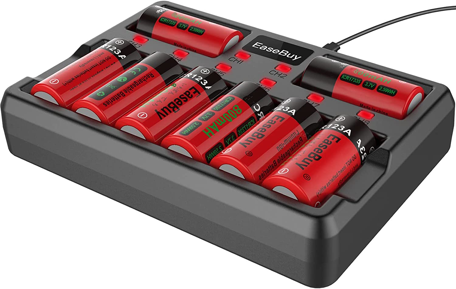Arlo Batteries Rechargeable 8 Pack, EaseBuy 800mAH NiMH 123A Arlo Batteries and CR123A Charger for Arlo VMS3130 VMC3030 VMK3200 VMS3330 3430 3530 Cameras, August Pro WiFi, Alarm System, Flashlight