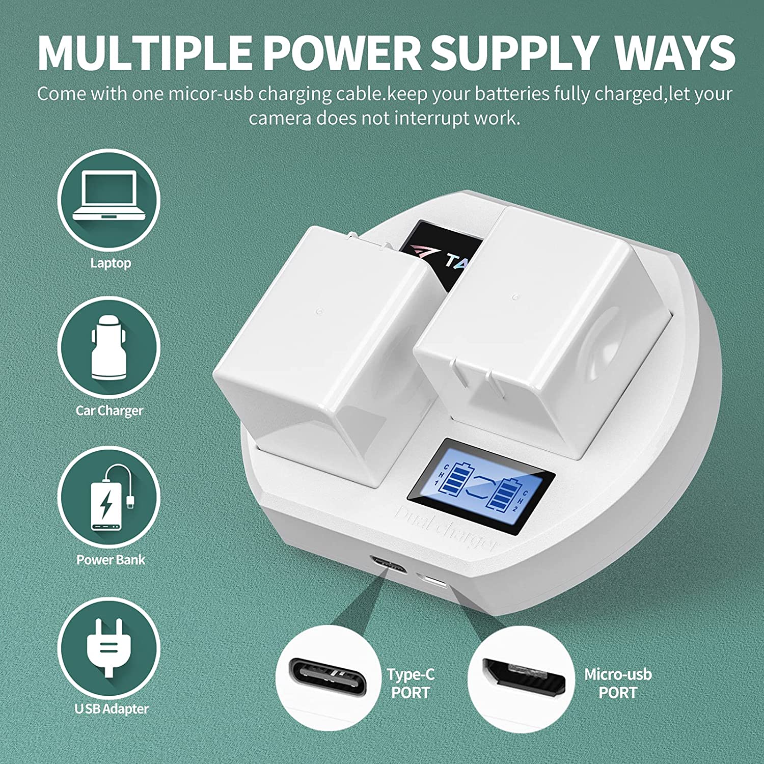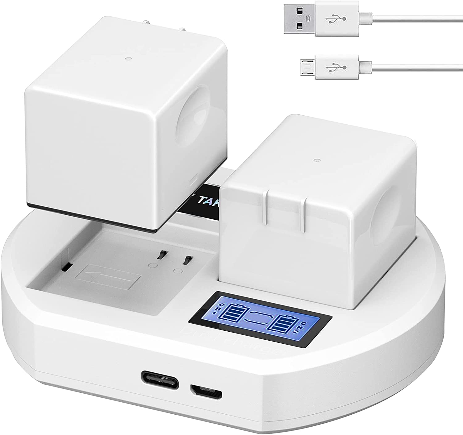 • Dual Arlo Pro 2 Charger - Arlo battery charger can charging two batteries at the same time, effectively saving charging time. arlo pro charger has both USB-C and USB micro connectors can connect with your laptop, AC adapter, car adapter, power bank, etc, It is 20% faster when charging one battery and LCD Display Screen shows the battery's power of each battery.