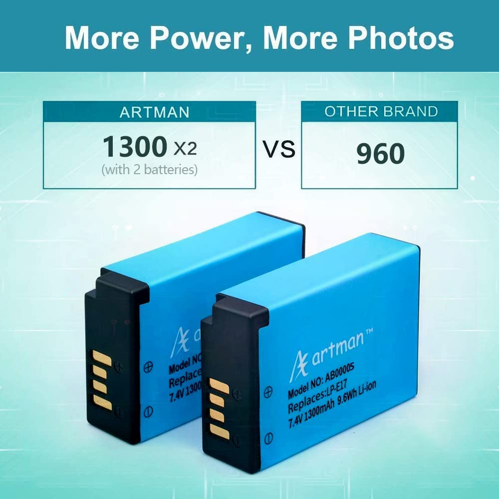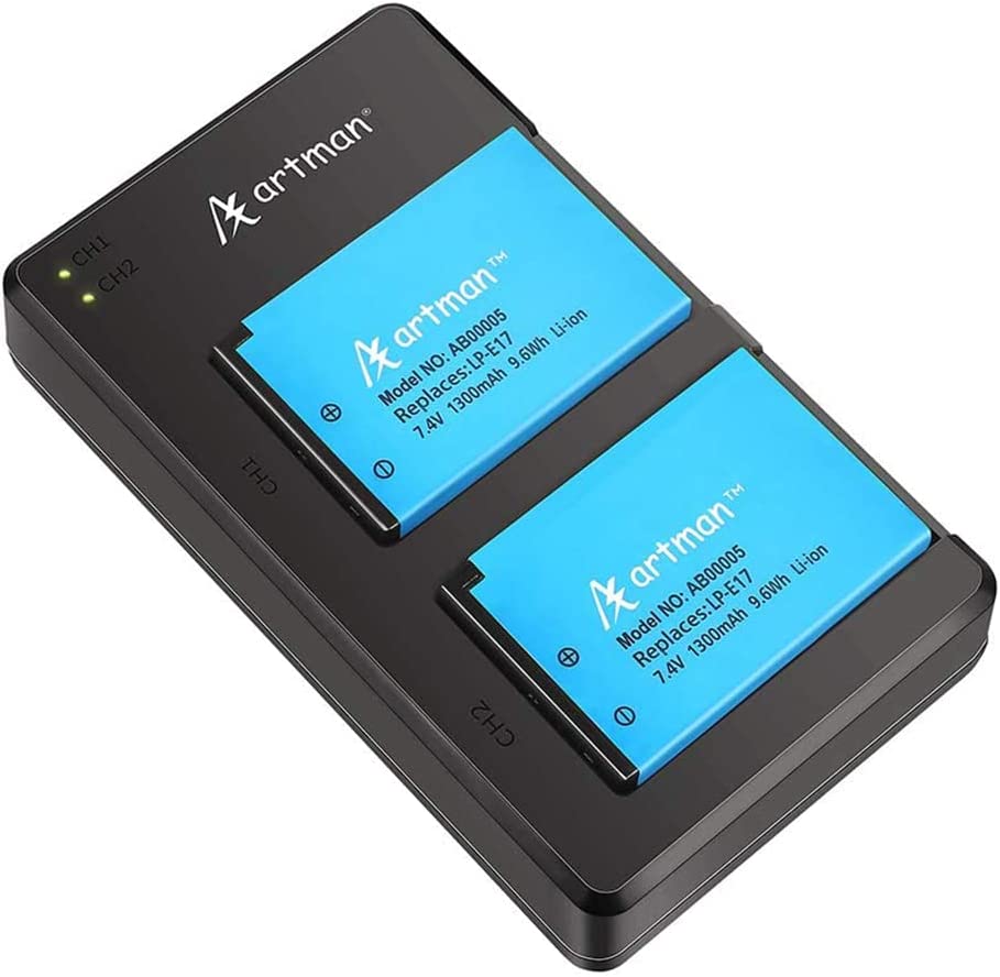 Artman 2-Pack LP-E17 Batteries and Rapid Dual USB Charger for Canon EOS RP, EOS R10,Rebel T8i, T7i, T6i, T6s, SL2, SL3, EOS M3, M5, M6, EOS 200D, 77D, 750D, 760D, 800D, 8000D, Digital SLR Camera