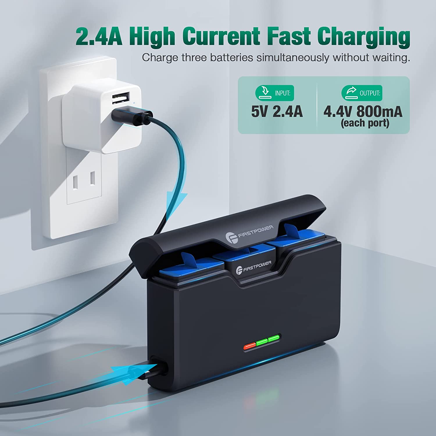 • 【3-Channel Portable Quick Charger】FirstPower triple slot charger can store three GoPro 11/10/9/8/7/6/5 batteries and two TF cards, supports 5V/2.4A input, 4.4V 800mA (per port) output. Compact and lightweight storage box design can be carried with you, making your journey easier!