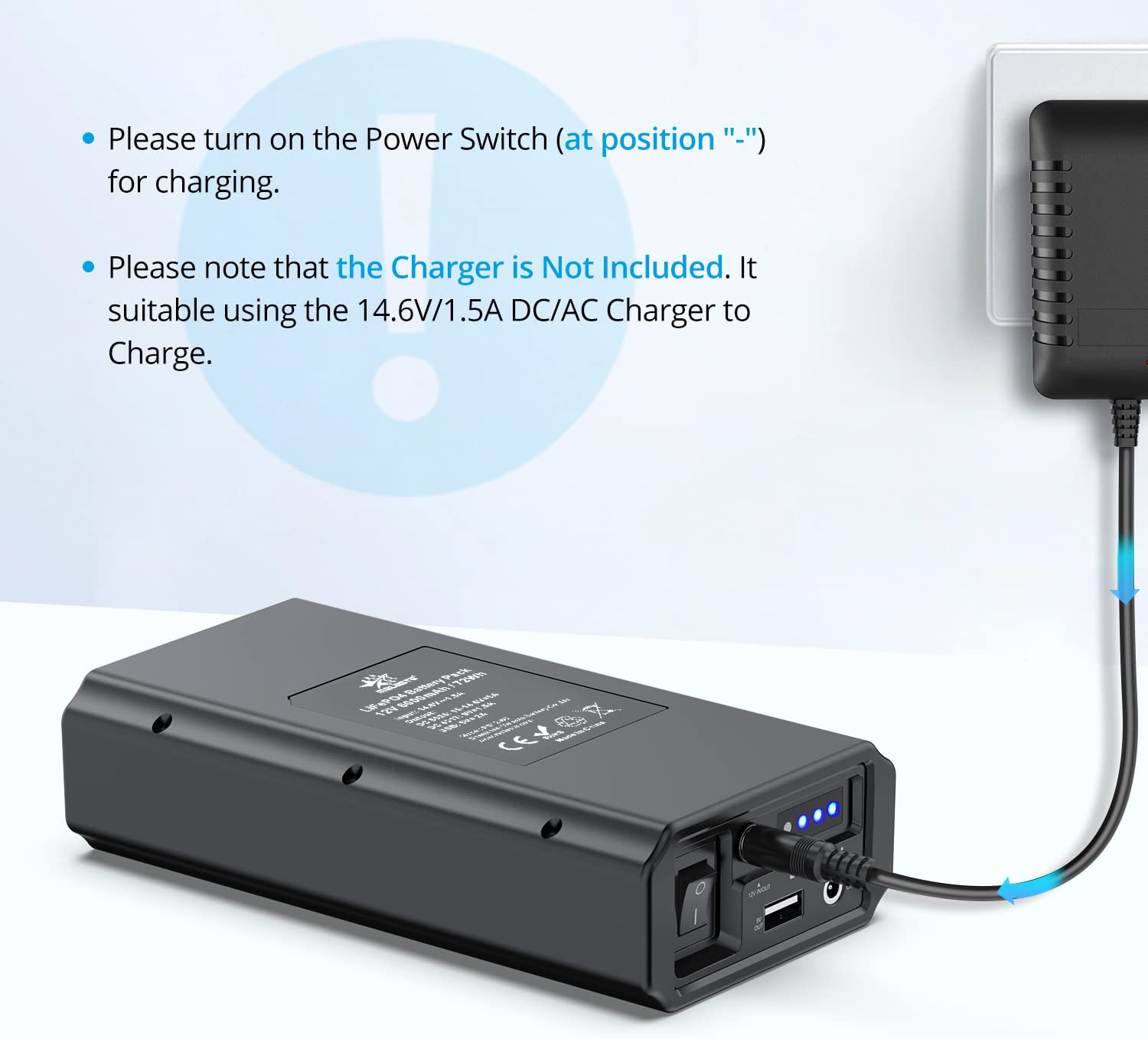 • What will you get: 1* 12V 6000mAh rechargeable Battery Pack (5V port can using as power bank), 1* DC5525 male cable for 12V output port, 1* DC4017 male cable for 9V output port, and 1* User Manual. ★Please confirm the size of the input port on your device before purchasing. ★★Please note that the Charger is Not Included. It suitable using the 12.6V/1.5A DC/AC Charger to Charge.)