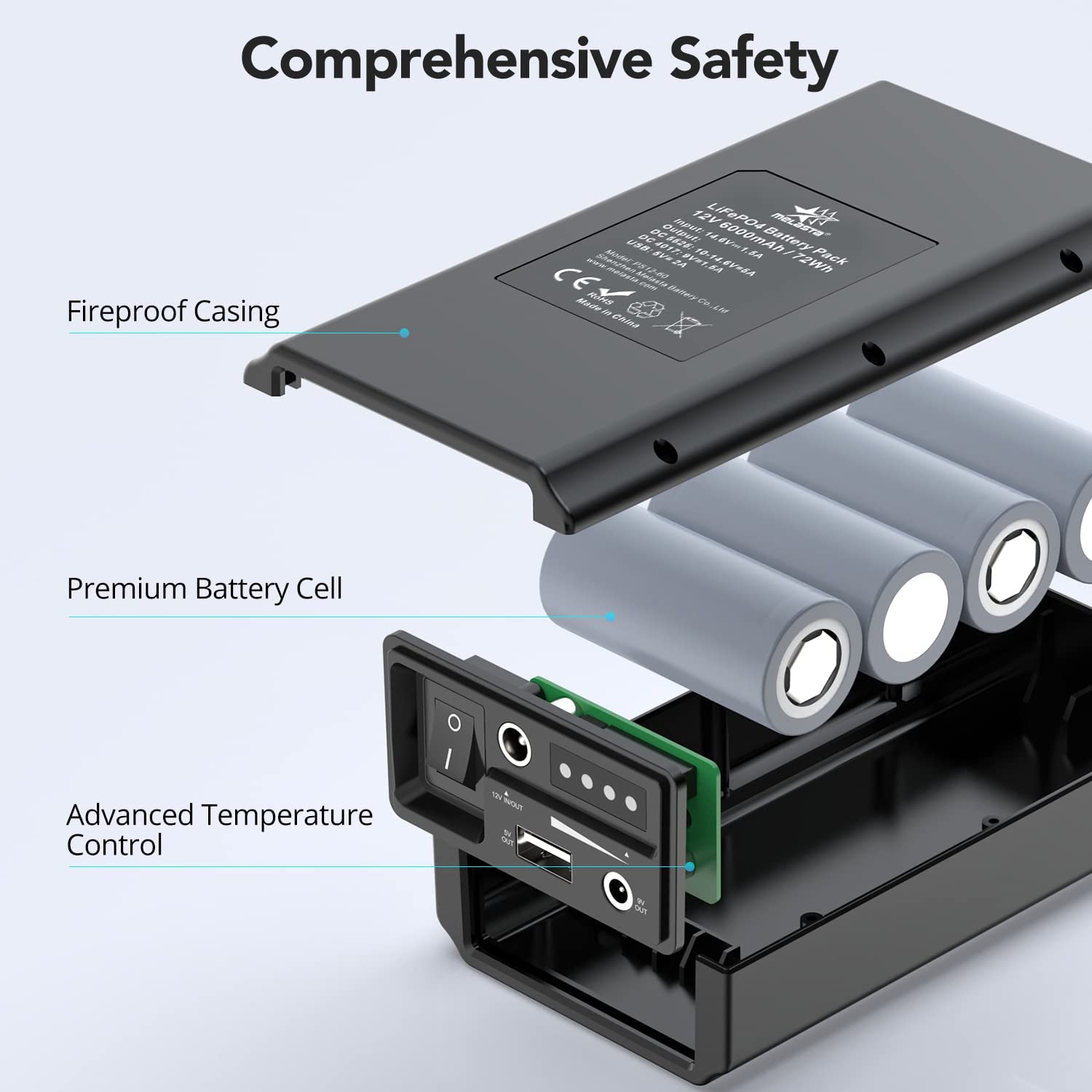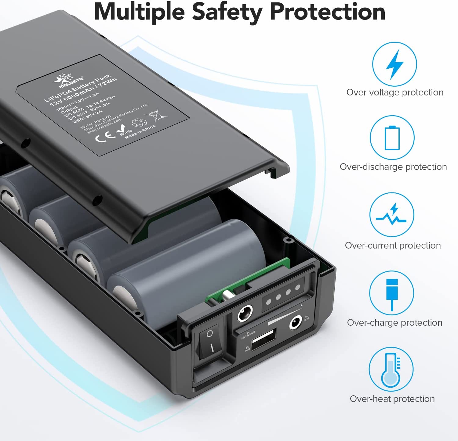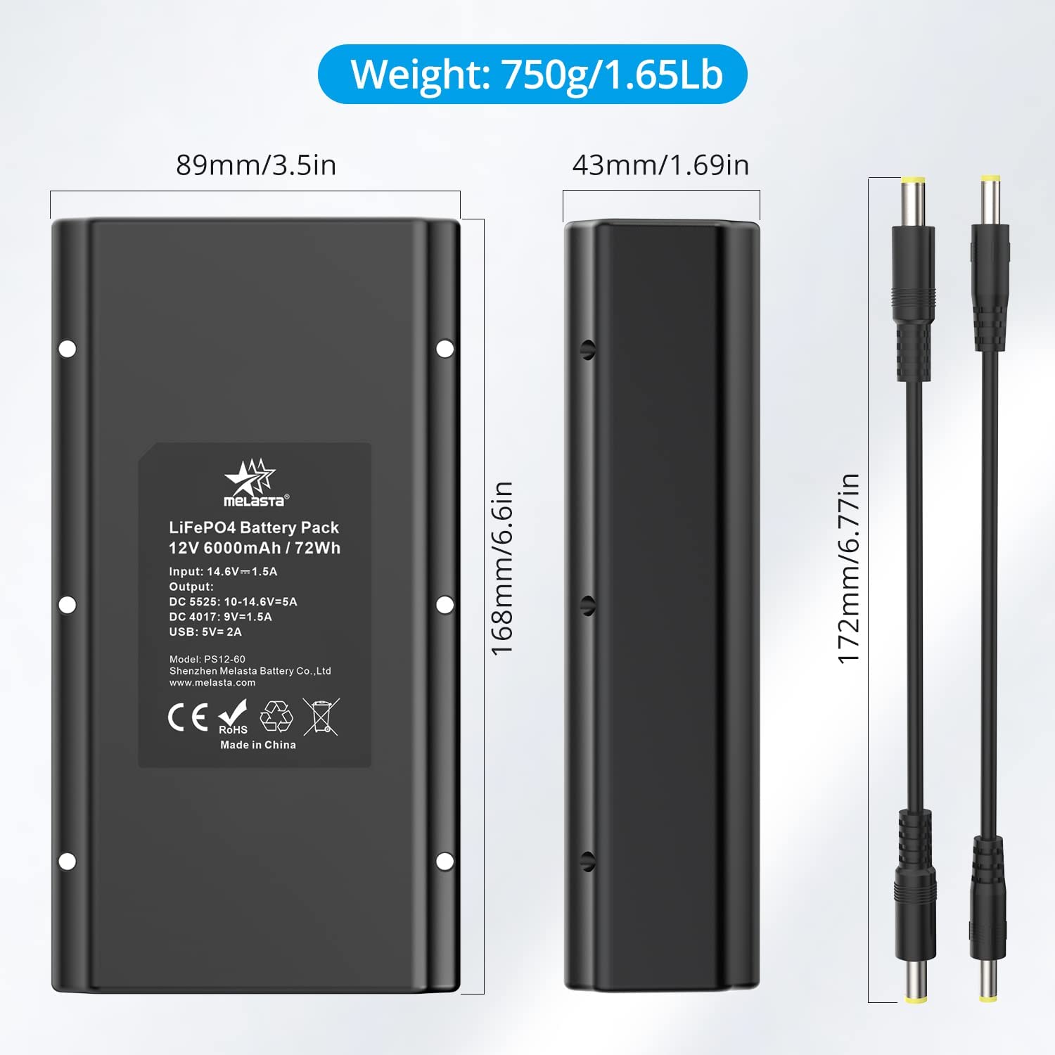 melasta 12V LiFePO4 Battery Pack, 6000mAh Rechargeable Lithium ion Phosphate Battery Power Bank with 12V 9V DC and 5V USB Output, for LED Light Strip CCTV Camera Telescope Mobile (Without Charger)