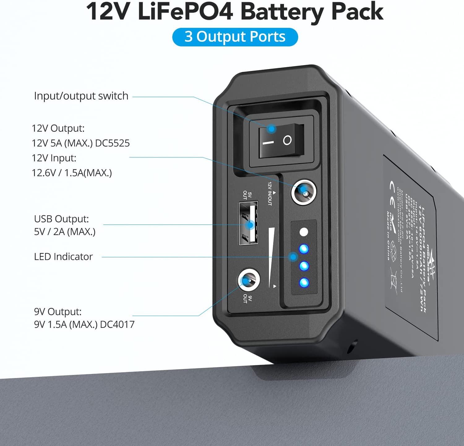 • Three output ports battery pack: DC 12V 9V and 5V USB output designed lithium rechargeable battery pack. The Voltage range of the 12V output port is 12.6-9V, it is not constant, compatible with most 12 volt devices. The 9V and 5V is constant. There are 4 LED indicators to let you know the charging and discharging status.