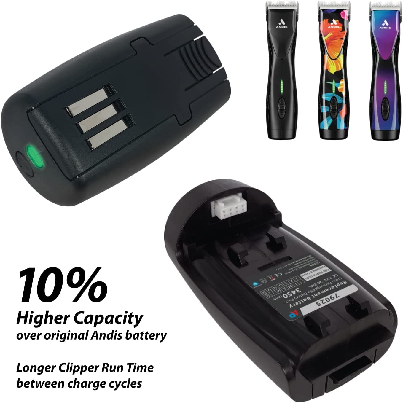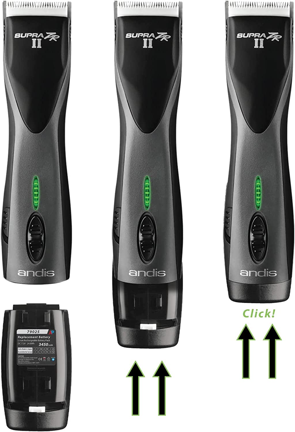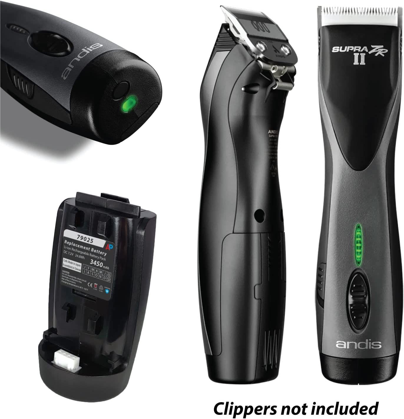 Replacement battery for the Andis Supra ZR II and Pulse ZR II Clippers Clippers. Our removable and rechargeable replacement Li-ion battery pack features a 3450 mAh capacity rating, which is 10% higher than the original Andis 79025 and DBLC-2 models. This equals to well over 3 hours of battery run time on a fast charge of under 2 hours.