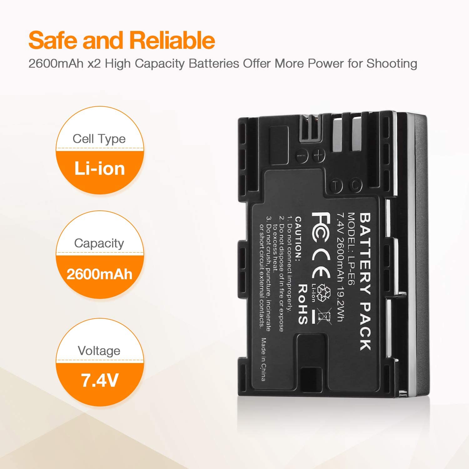 • Compatible model works well with more popular Camera: LP-E6 LP-E6N batteries 5D Mark II, 5D Mark III, 5D Mark IV, 5DS, 5DS R, 6D, 6D Mark II, 7D, 7D Mark II, 60D, 60Da, 70D, 80D, R, XC10, XC15 and more.