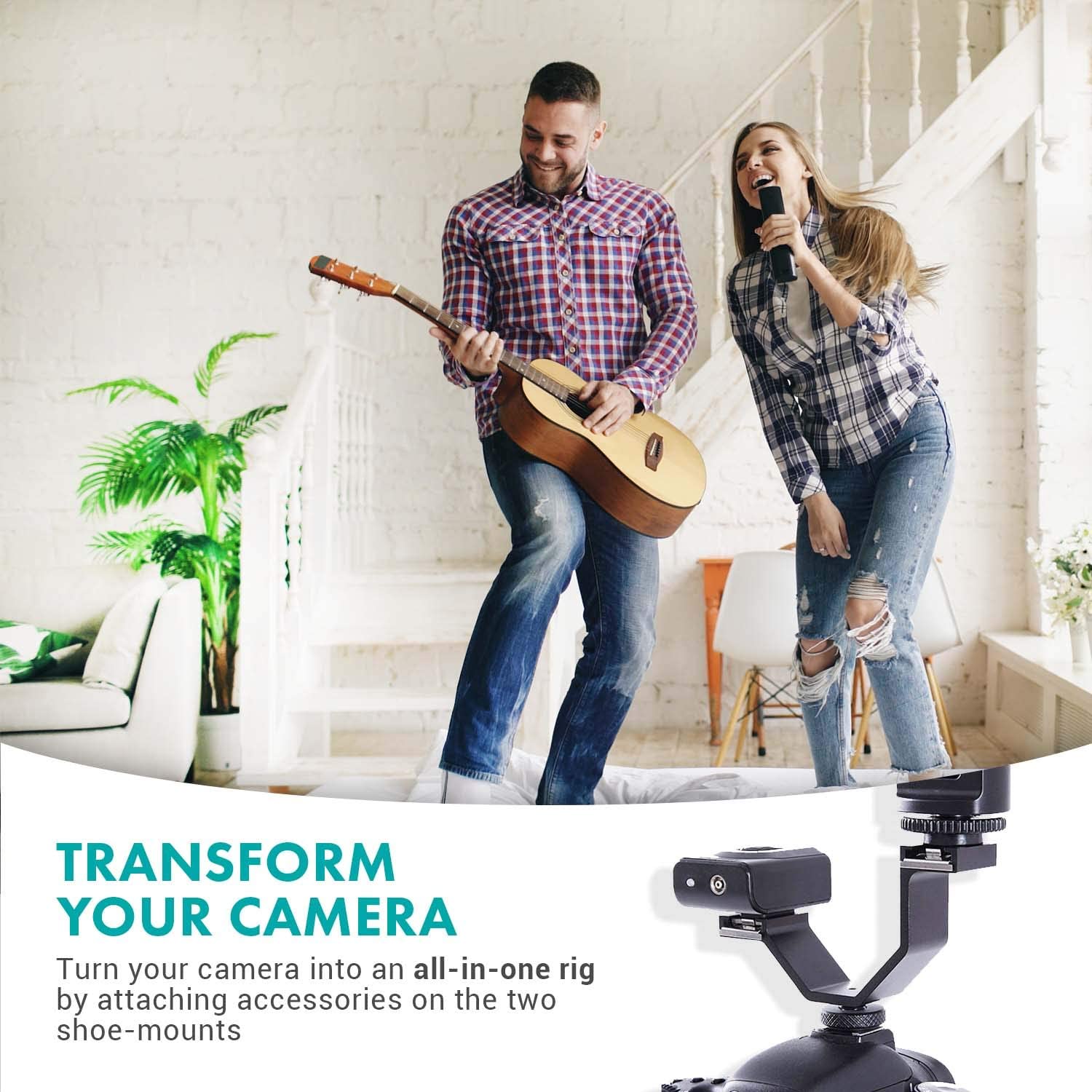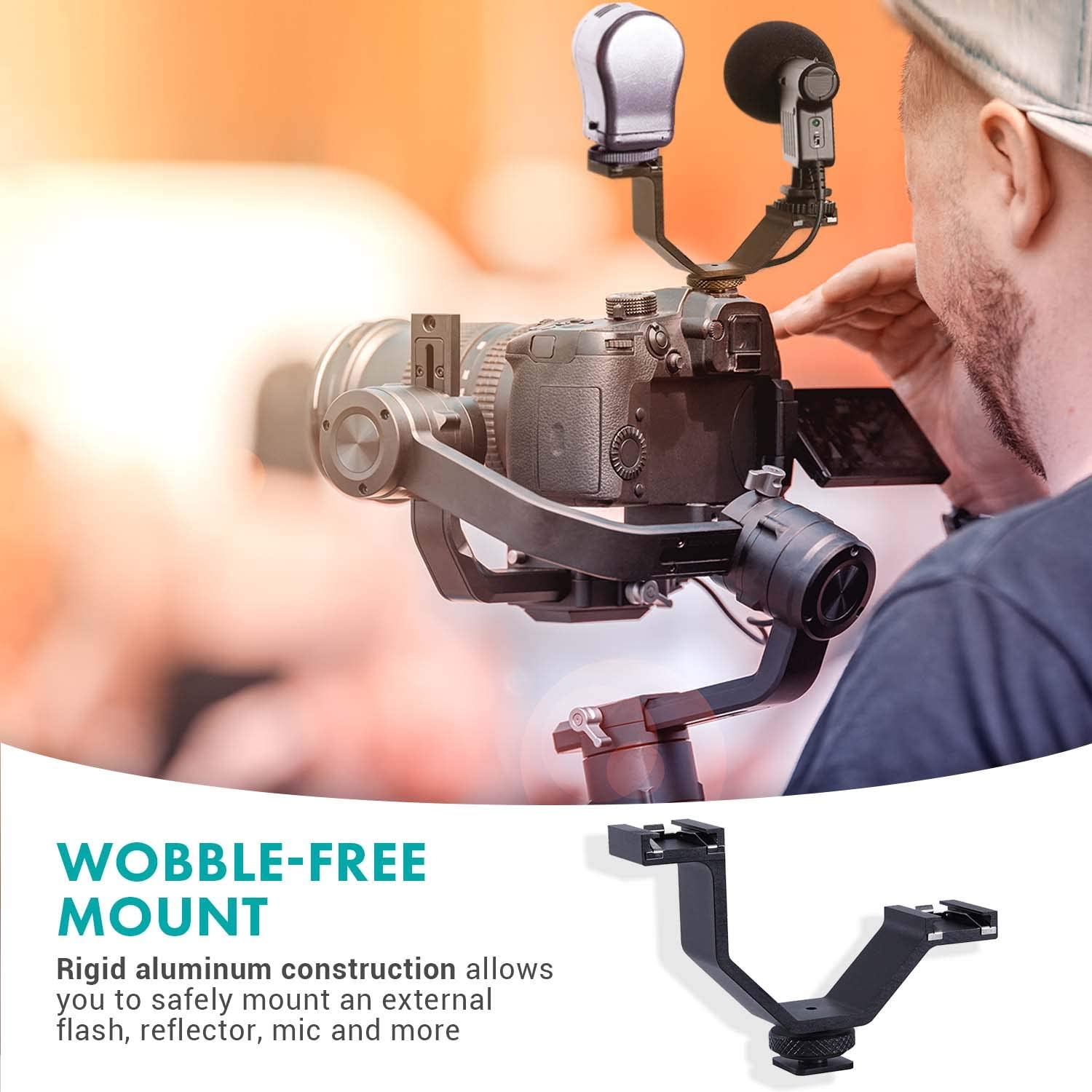 The Movo Photo HVA20 Accessory Shoe bracket mounts onto a camera's accessory shoe in order to provide two additional accessory shoes for mounting lights, monitors, microphones, or other accessories. In addition to the shoe mount, a 1/4-20 thread is also available for attaching the bracket to a tripod, rig, or other bracket featuring a 1/4-20-threaded mount. The bracket is constructed from rigid, yet lightweight aluminum alloy, and the mounting shoes are machined out of the same piece as the bracket, for additional strength. The accessory shoes also feature backstops for greater security when attaching accessories. The bottom shoe that attaches to the camera features a locking pin, which keeps the shoe in place and prevents the shoe from rotating during use.