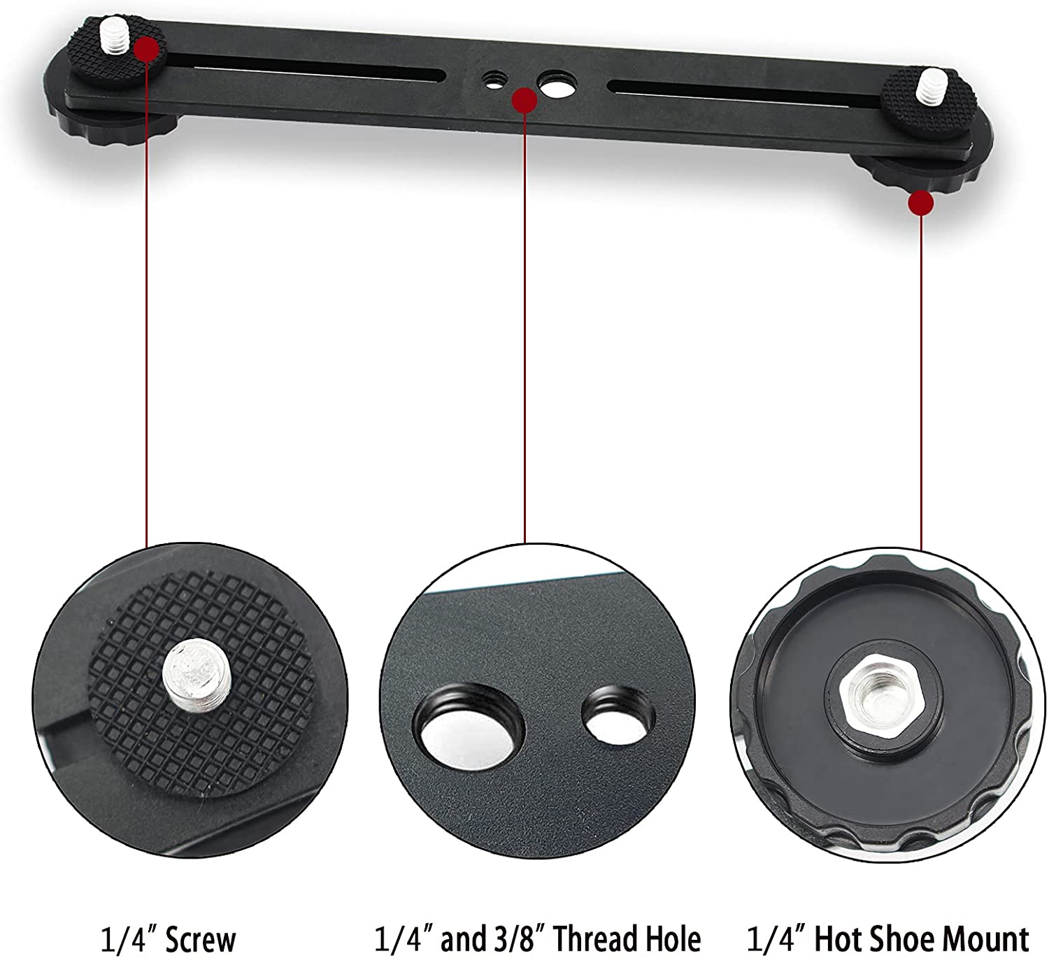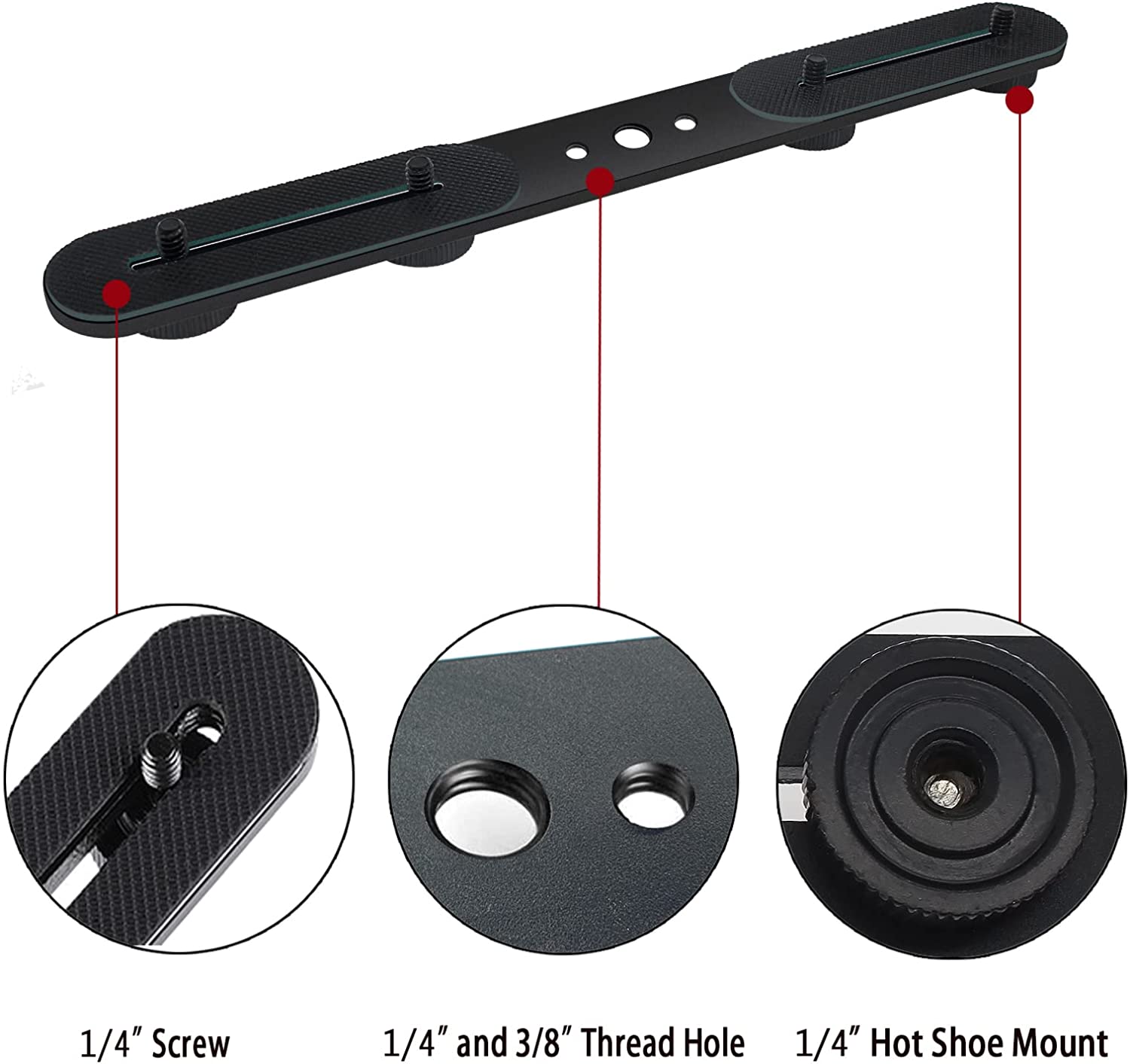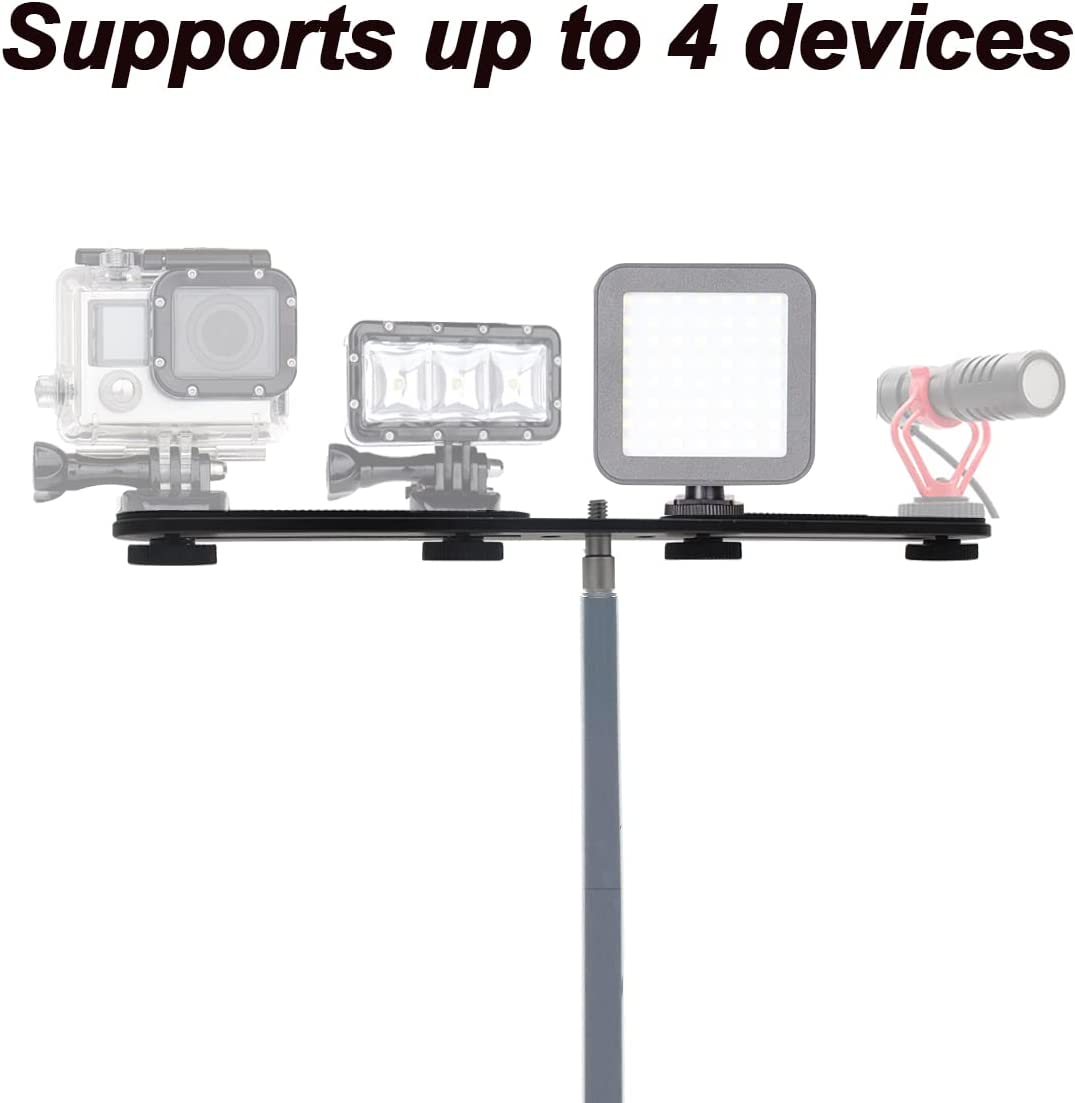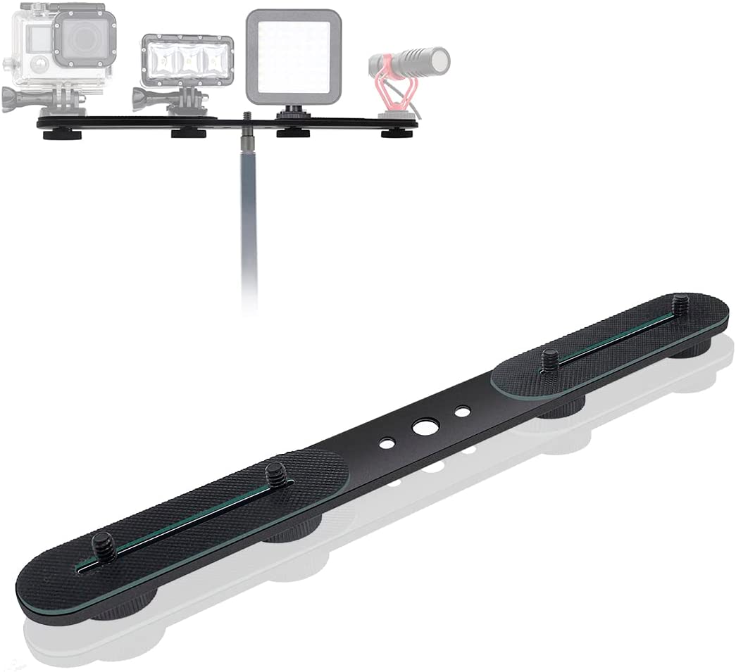 • 1/4" and 3/8" threaded hole design, including four 1/4" adapter screws New design: Hot shoe adapter supports two cameras or flashes at the same time Non-slip rubber pads for added shock resistance