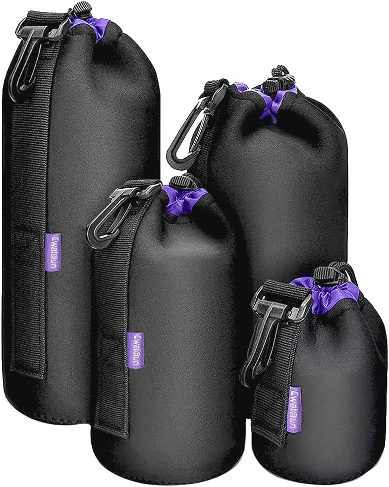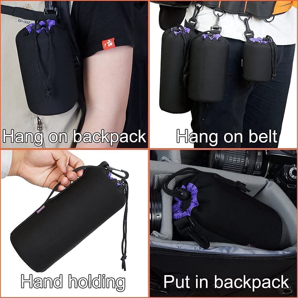• 【4 Packs Lens Bags】You will get a set of four neoprene lens pouches: S, M, L, XL. Water-resistant lens bags for Canon, Nikon, Sony and other DSLR and Mirror-less camera lenses in different sizes. DIY uses: placing water cup, coffee cup and so on. Soft faux plush lining for a unique style and protection against scratches.