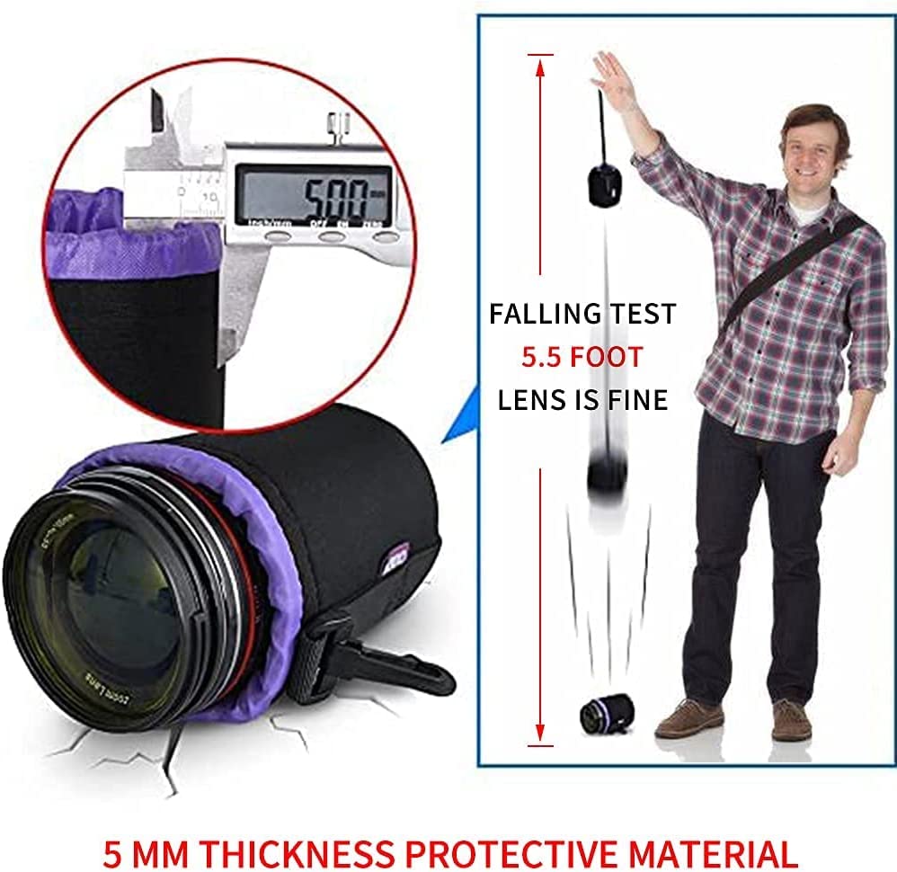 • 【Good Protection Materials】5mm/0.2inchs elastic thickness neoprene provides the best protection for camera lens.Thick pliable neoprene body avoid damage when lens falling down accidentally, and protects against moisture, sand, dust, water, accidental bumps or scratches.