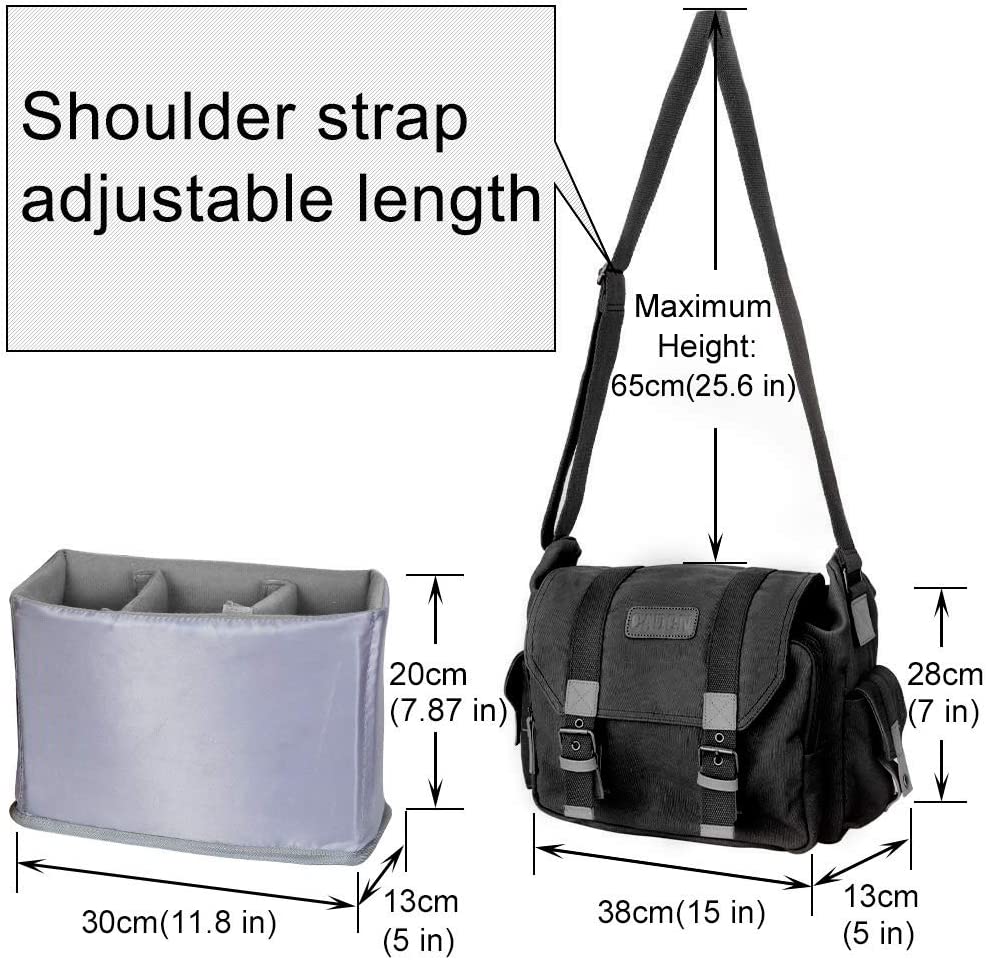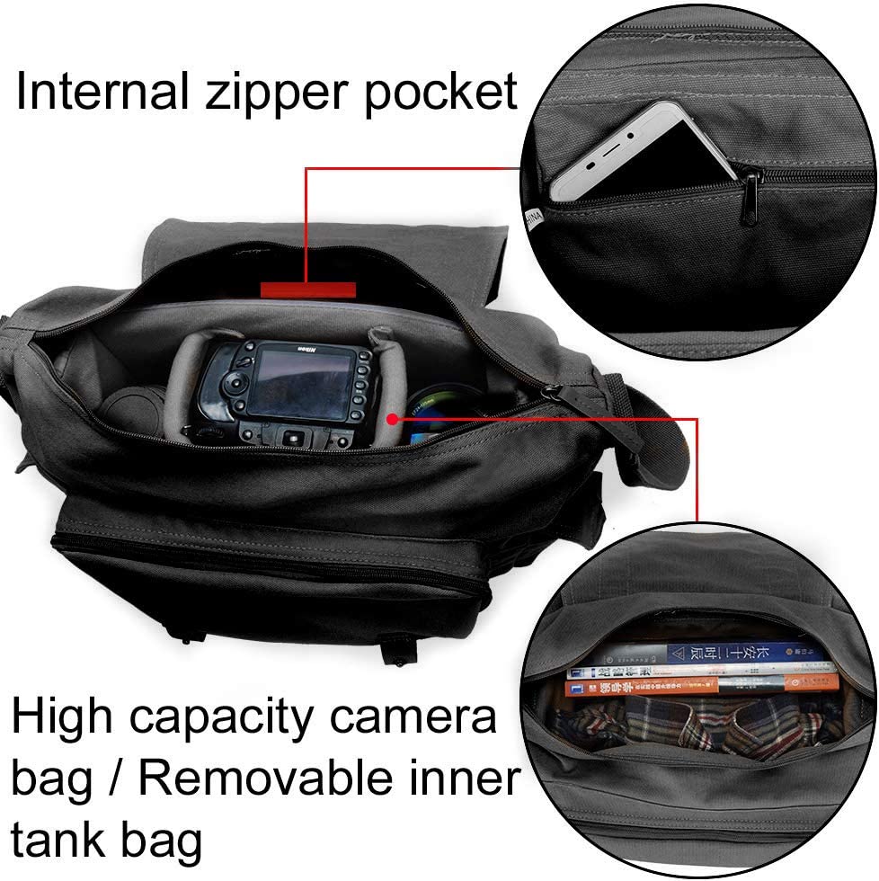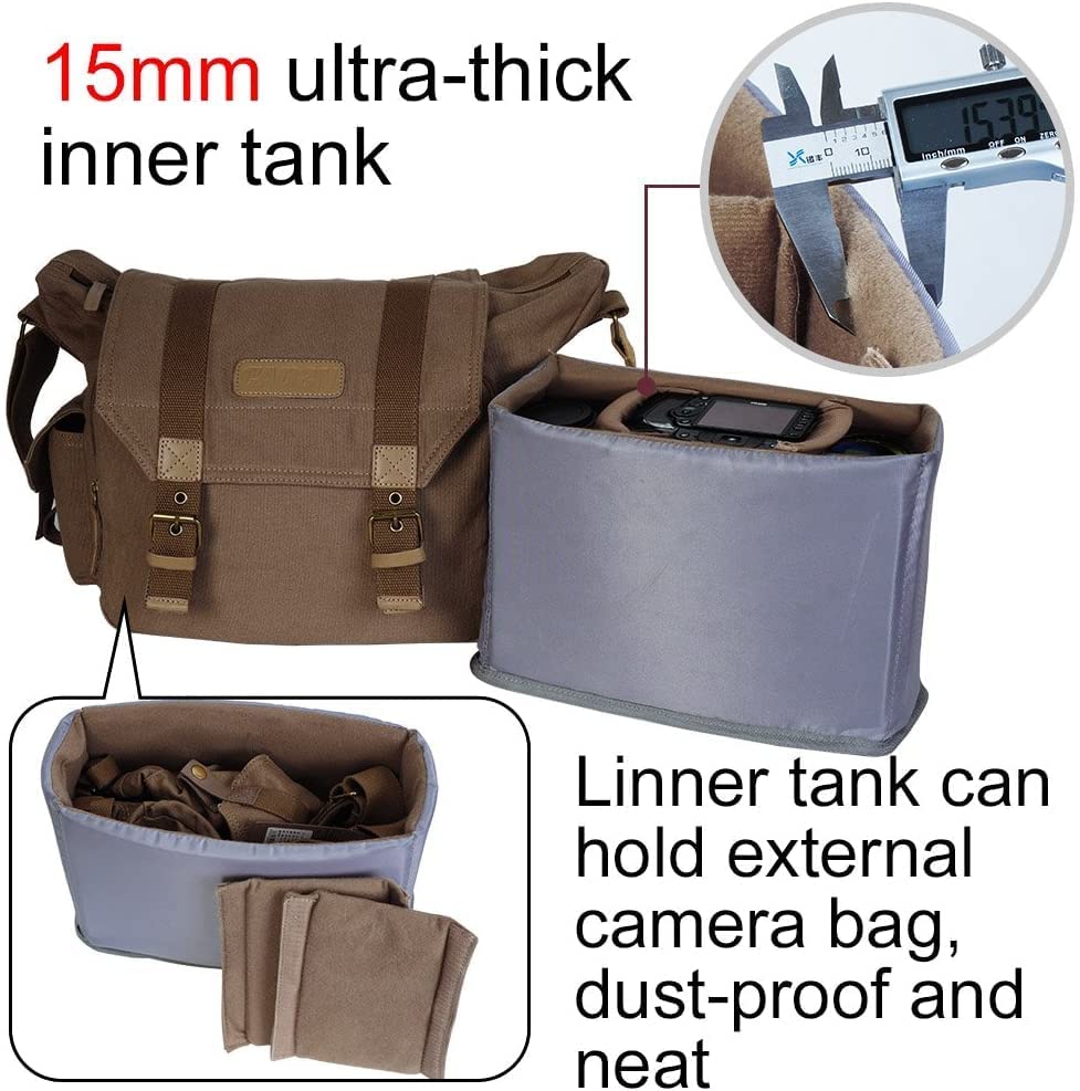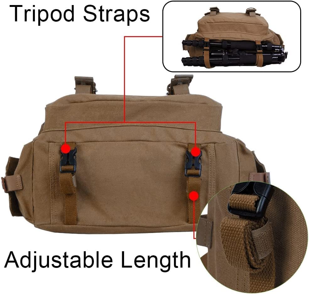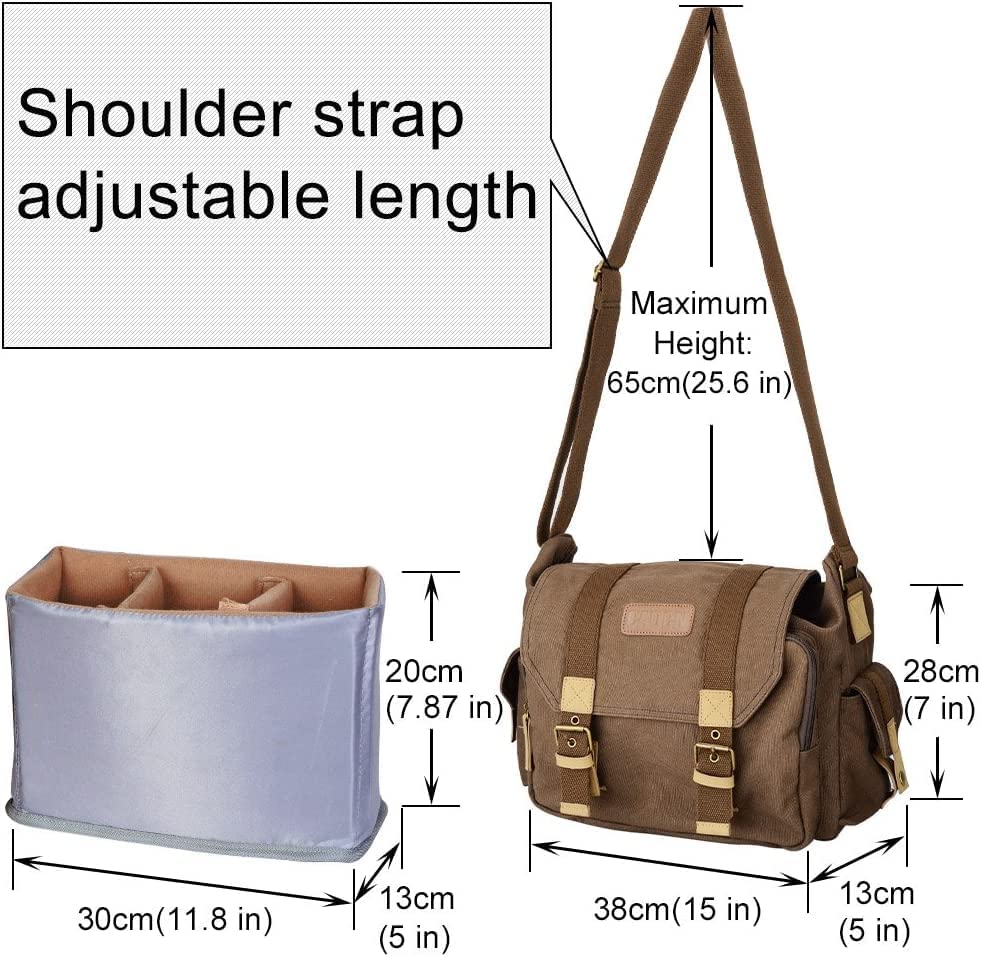 • 【Multi-Functions】①Dual use, it is a professional camera bag and outdoor travel bag;②The width of shoulder strap nearly 2 inches, comfort and decompression. Lengthening design, best for Americian. ③12MM thickness high-density PE foam inner bag, shockproof and drop-resistant.④The capacity of the travel outdoor canvas camera bag can be changed by holes on buckle strap.