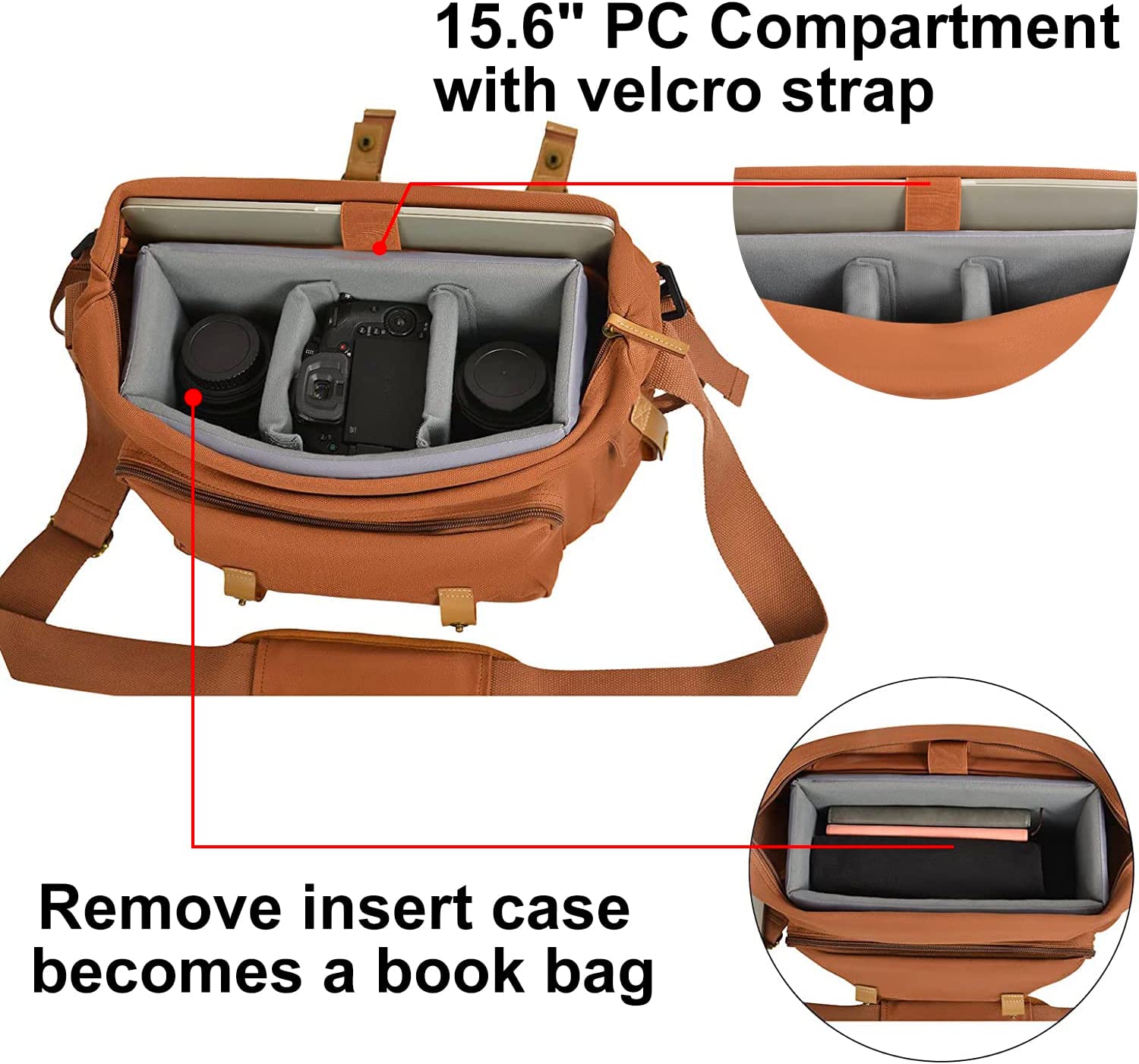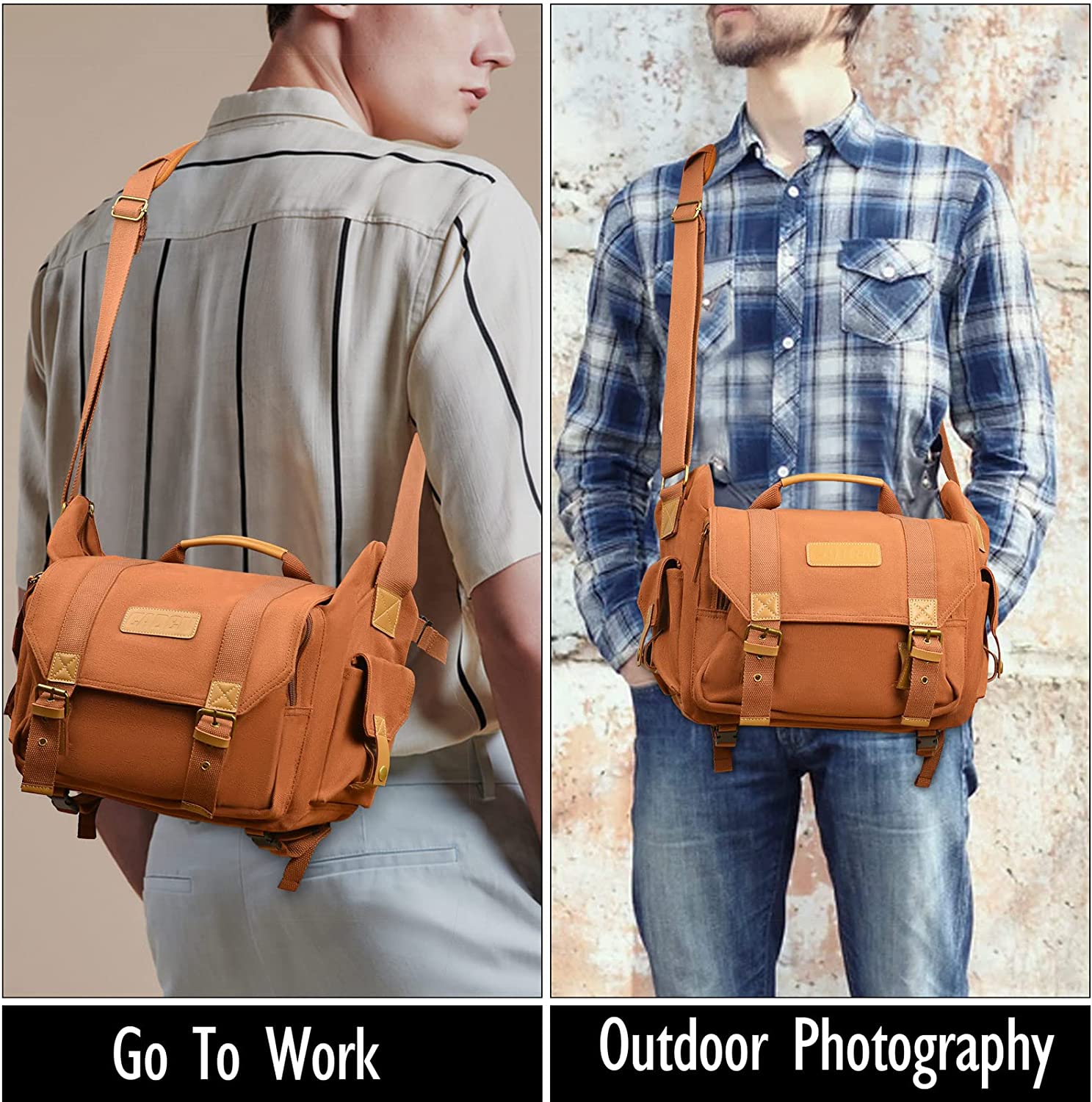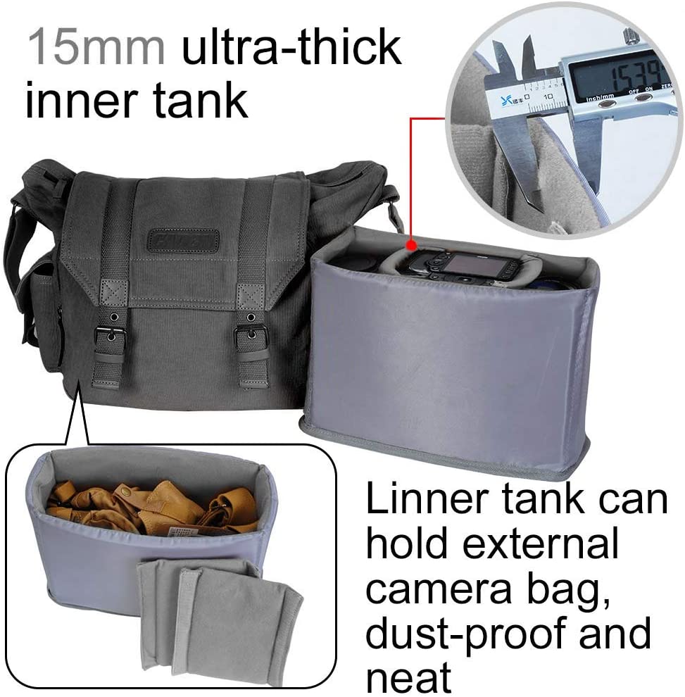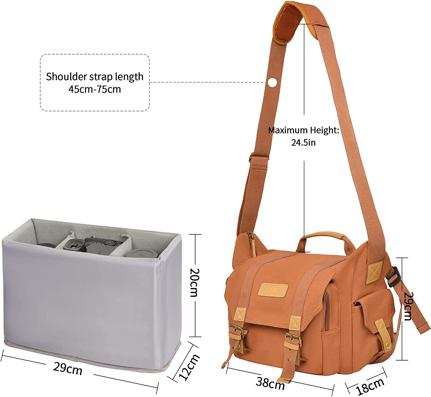 • 【Multi-Functions】①Dual use, it is a professional camera bag and outdoor travel bag;②The width of shoulder strap nearly 2 inches, comfort and decompression. Lengthening design, best for Americian. ③12MM thickness high-density PE foam inner bag, shockproof and drop-resistant.④The capacity of the travel outdoor canvas camera bag can be changed by holes on buckle strap.