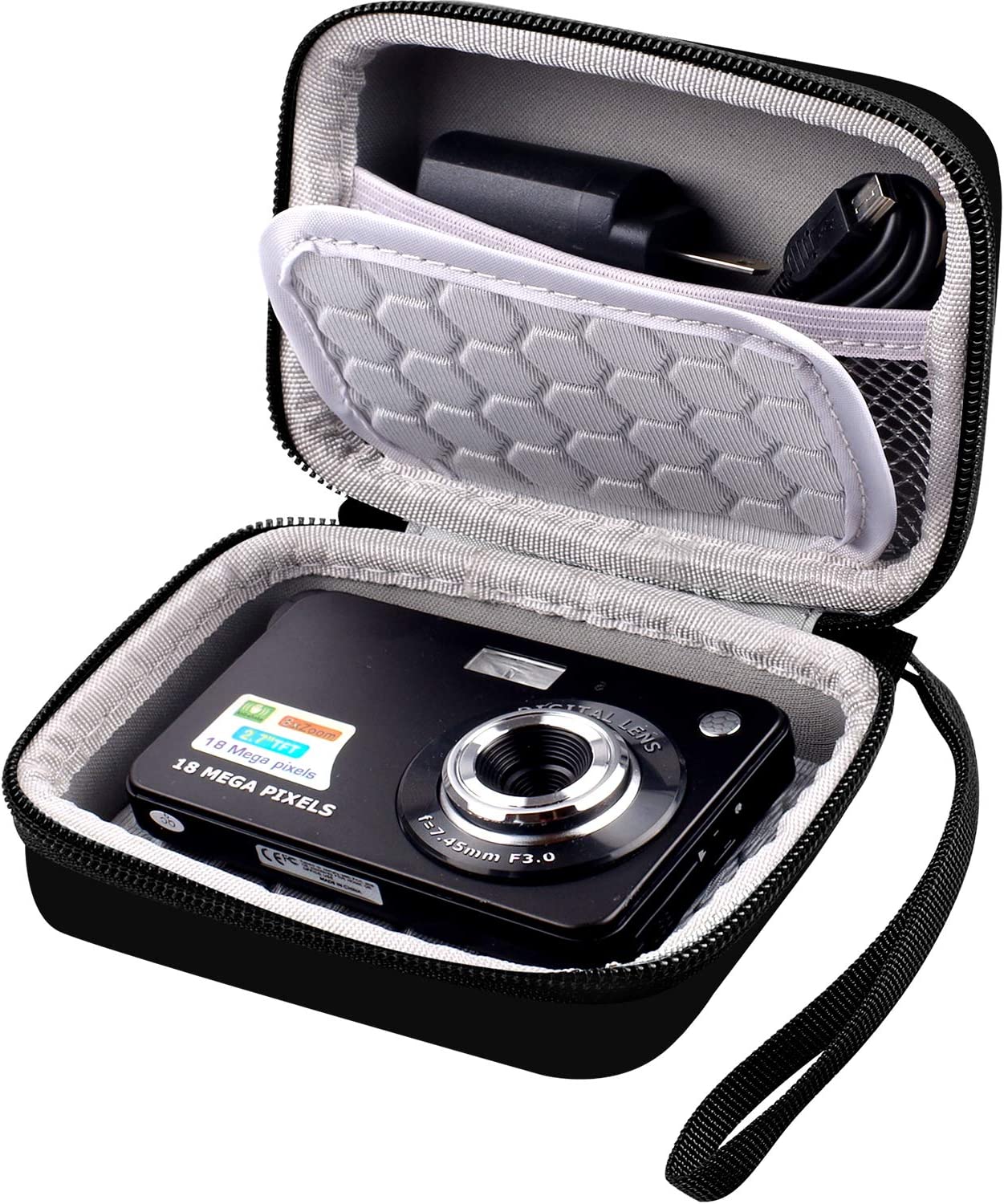 • ◆Professionally Protective Interior: Soft fabric and 2 layers of anti-shock bubble are to avoid damage caused by bumps and fall, prevent your digital camera from colliding and scratching with USB cable and charger, so it has no wiggling in compact interior space.with a mesh pocket for you to store your camera, USB cable, charger and other accessories.