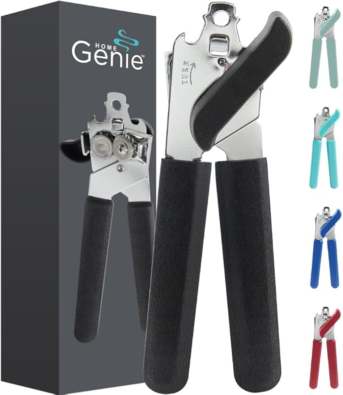Home Genie Can Opener, Stainless Steel and Rust Resistant Blade, HandHeld Easy Turn Knob, Smooth Edge Cut on Lids, Large Handles with Bottle Top Openers, Kitchen Tool Accessories, Black