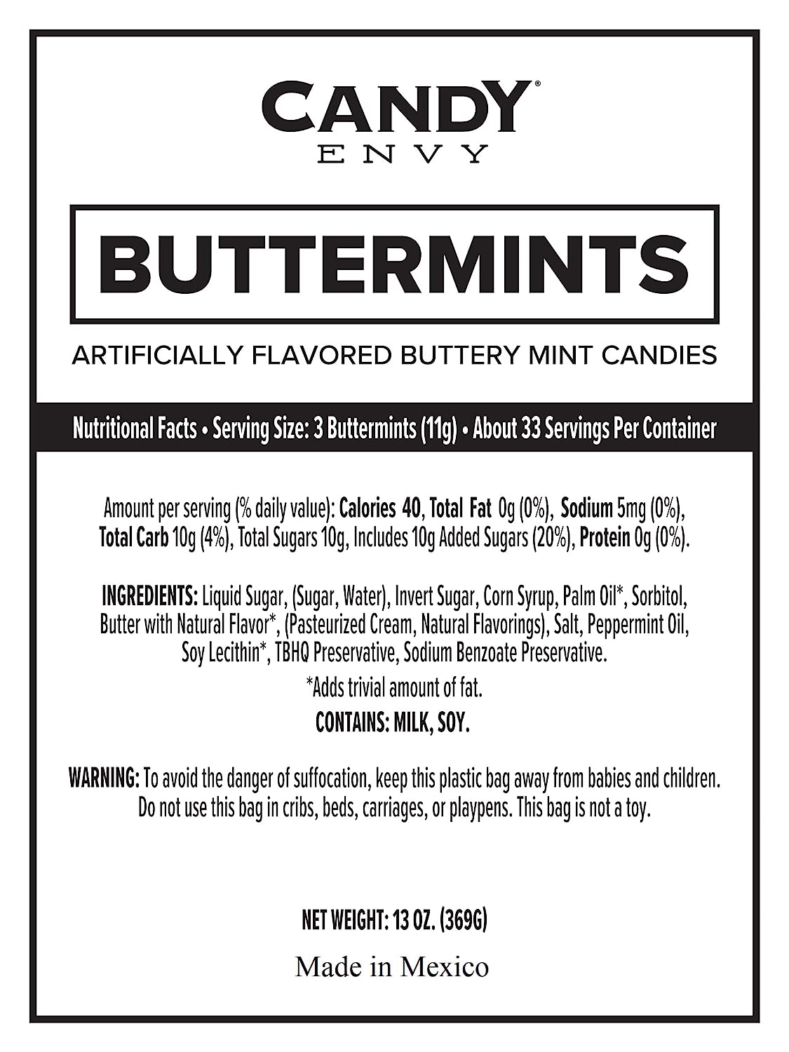 13 oz. bag of individually-wrapped soft buttermints. Each bag contains approximately 100 mints.