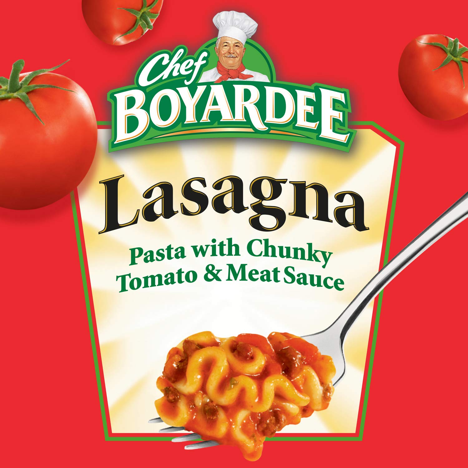 Made with vine-ripened tomatoes and meat sauce, this microwavable meal makes a satisfying dish that the whole family will love. All of this is packed into a microwavable bowl, so you can have a delicious snack in just 45 seconds. Don’t bother with dishes—just heat and enjoy! Chef Boyardee Lasagna contains no artificial flavors, colors, or preservatives. With 7 g protein and 0 g trans fat per serving, Chef Boyardee Lasagna is perfect for a flavorful dinner your family will love. From pizza sauce to spaghetti, ravioli, and lasagna, there's something for everyone to enjoy from Chef Boyardee.