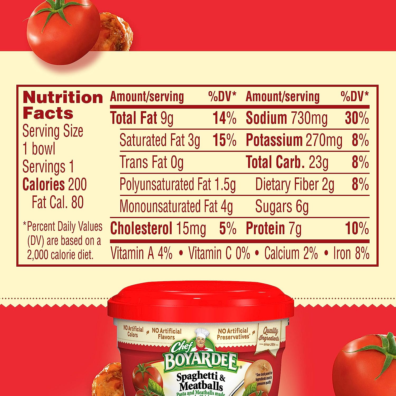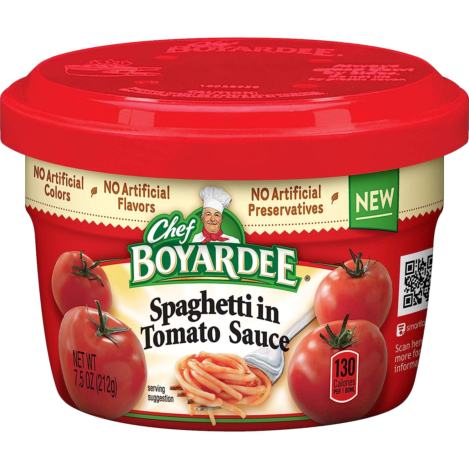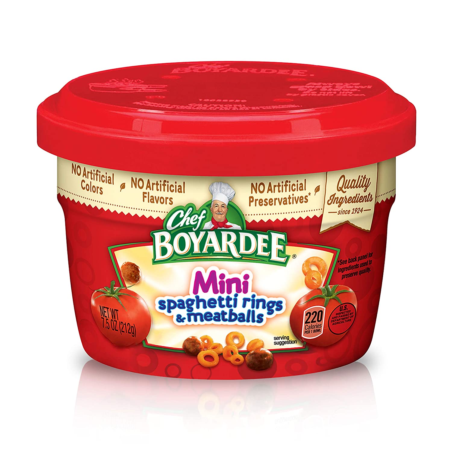 Chef Boyardee Spaghetti & Meatballs combines pasta noodles with hearty meatballs in a creamy tomato sauce. This classic Chef Boyardee crowd pleaser contains no artificial flavors, colors, or preservatives. Chef Boyardee meatballs are made with a combination of pork, chicken, and beef. The microwavable bowl makes it easy to create a quick pasta meal in minutes. With 7 g protein and 0 g trans fat per serving, Chef Boyardee Spaghetti & Meatballs is perfect for a hearty dinner or tasty after school snack. From pizza sauce to spaghetti, ravioli, and lasagna, there's something for everyone to enjoy from Chef Boyardee.
