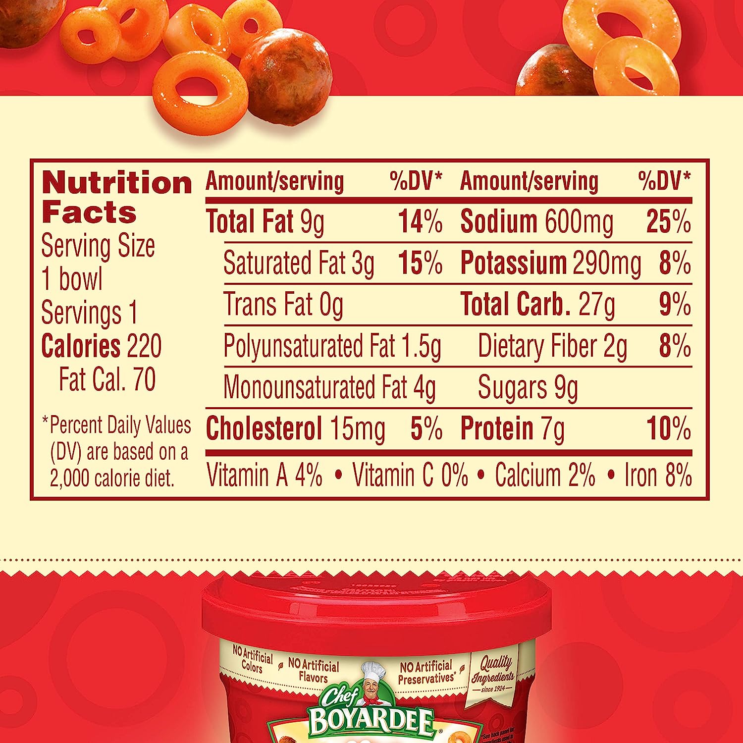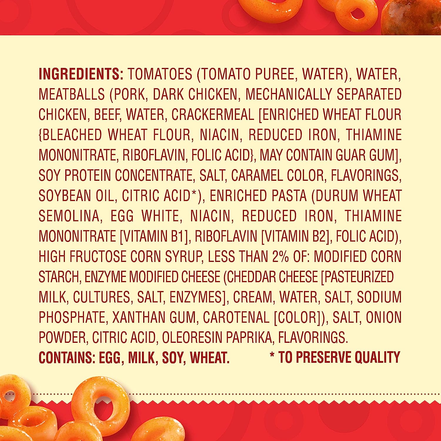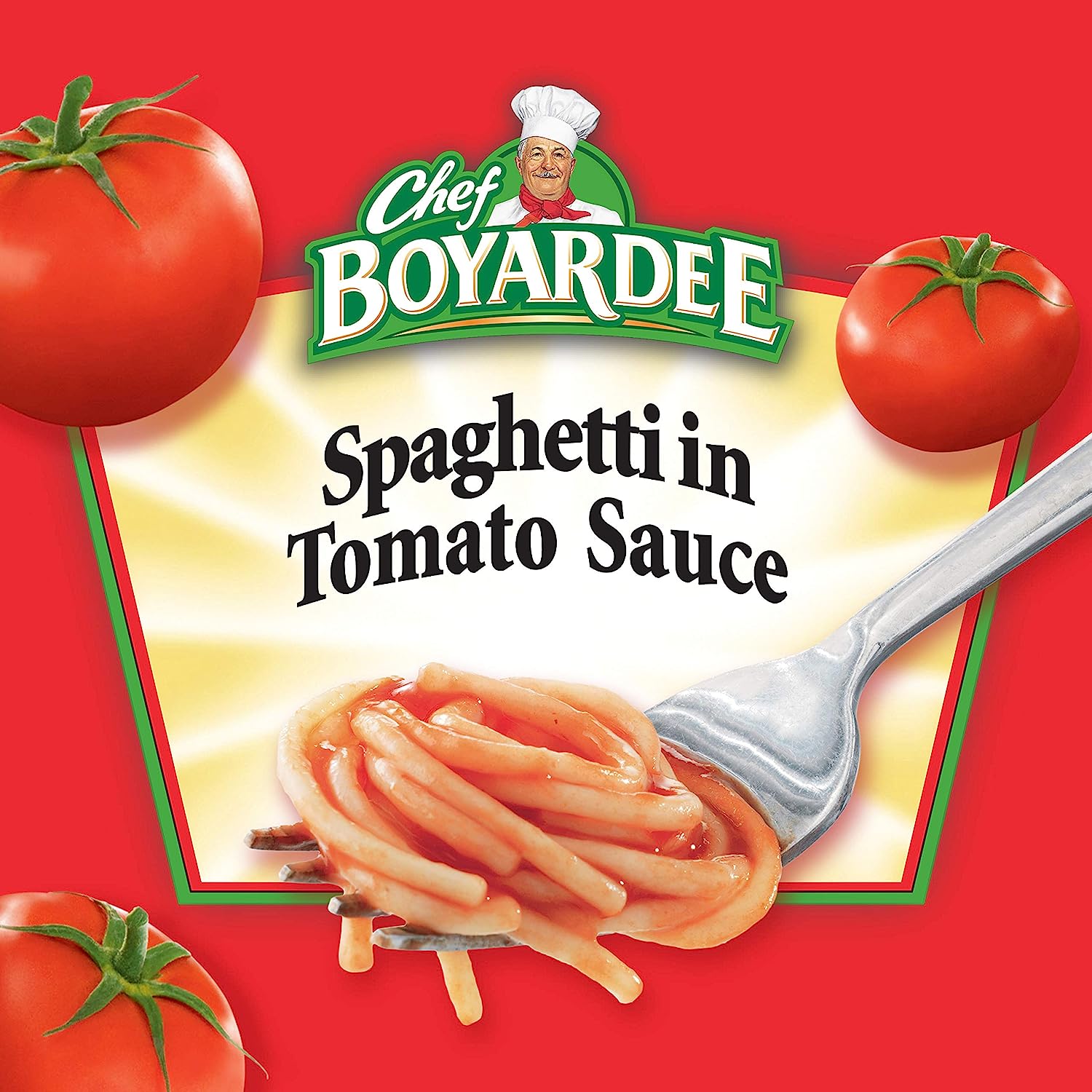 Chef Boyardee Spaghetti & Meatballs combines pasta noodles with hearty meatballs in a creamy tomato sauce. This classic Chef Boyardee crowd pleaser contains no artificial flavors, colors, or preservatives. Chef Boyardee meatballs are made with a combination of pork, chicken, and beef. The microwavable bowl makes it easy to create a quick pasta meal in minutes. With 7 g protein and 0 g trans fat per serving, Chef Boyardee Spaghetti & Meatballs is perfect for a hearty dinner or tasty after school snack. From pizza sauce to spaghetti, ravioli, and lasagna, there's something for everyone to enjoy from Chef Boyardee.