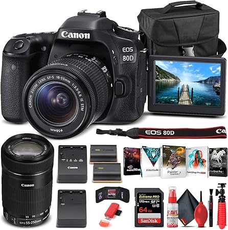 Canon EOS 80D DSLR Camera with 18-55mm Lens (1263C005) + EF-S 55-250mm Lens + 64GB Memory Card + Case + Corel Photo Software + LPE6 Battery + External Charger + Card Reader + More (Renewed)