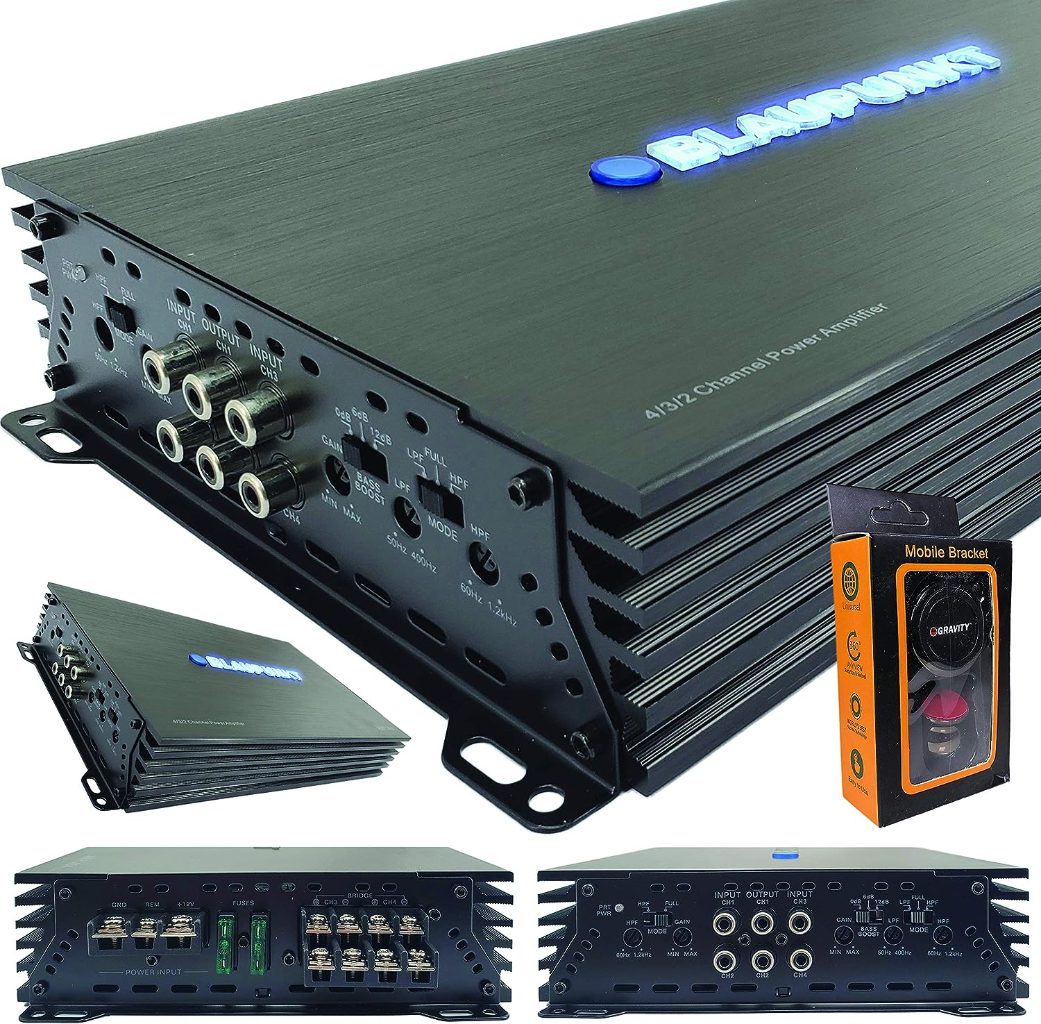 Blaupunkt AMP1404 Car Audio 4-Channel Amp Amplifier 1500 Watts Max Peak Power with Gravity Magnet Phone Holder Bundle