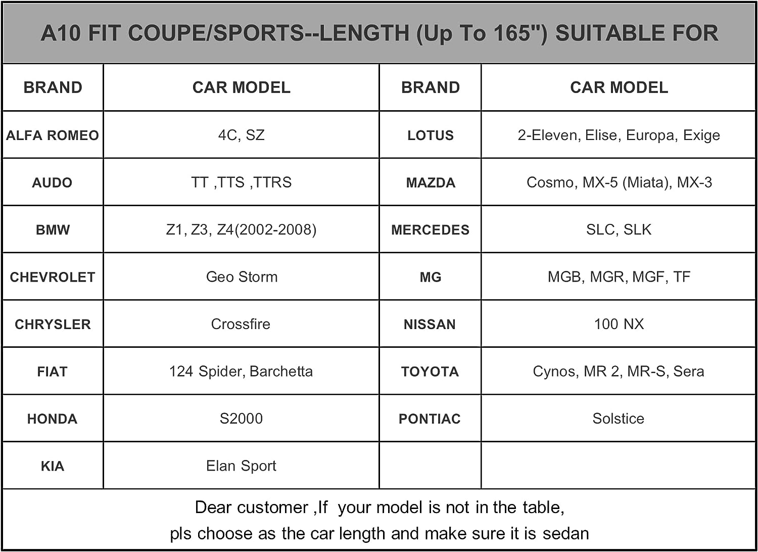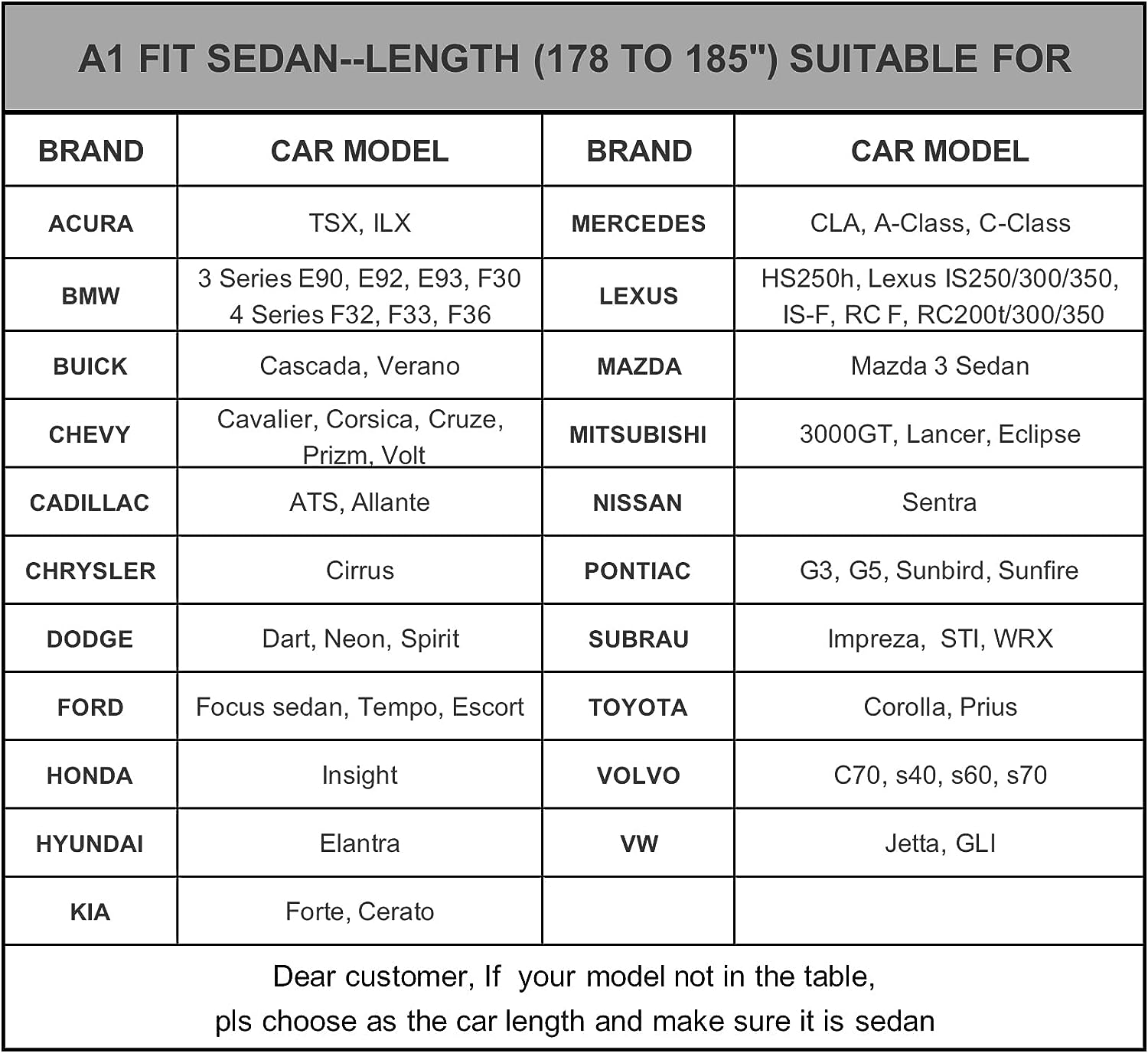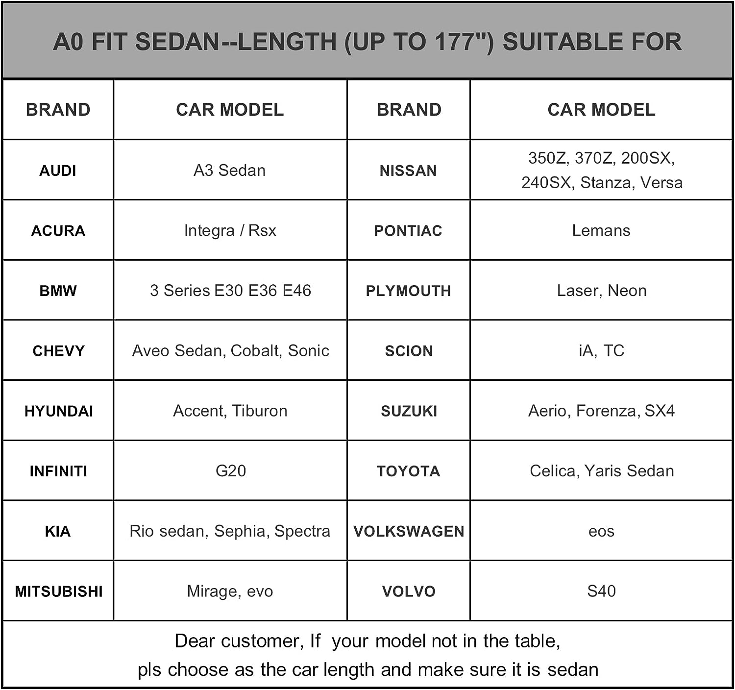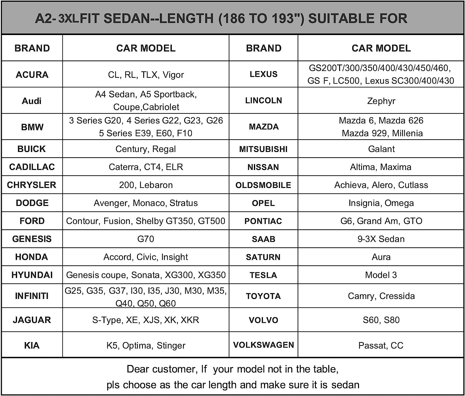 • 【Dimension A2 -3XL】Universal fit for sedan which length is 186 to 193 inch. (NOT FOR HATCHBACK AND SUV ). Suitable for Toyota Camry, Honda Accord/Civic, Nissan Altima/Maxima, Cadillac CT4, Kia K5/Optima/Stinger, Hyundai Sonata, Tesla model 3, Ford Fusion, Audi A4/A5/A6, BMW 5/6 Series, Mercedes-Benz C-Class etc.