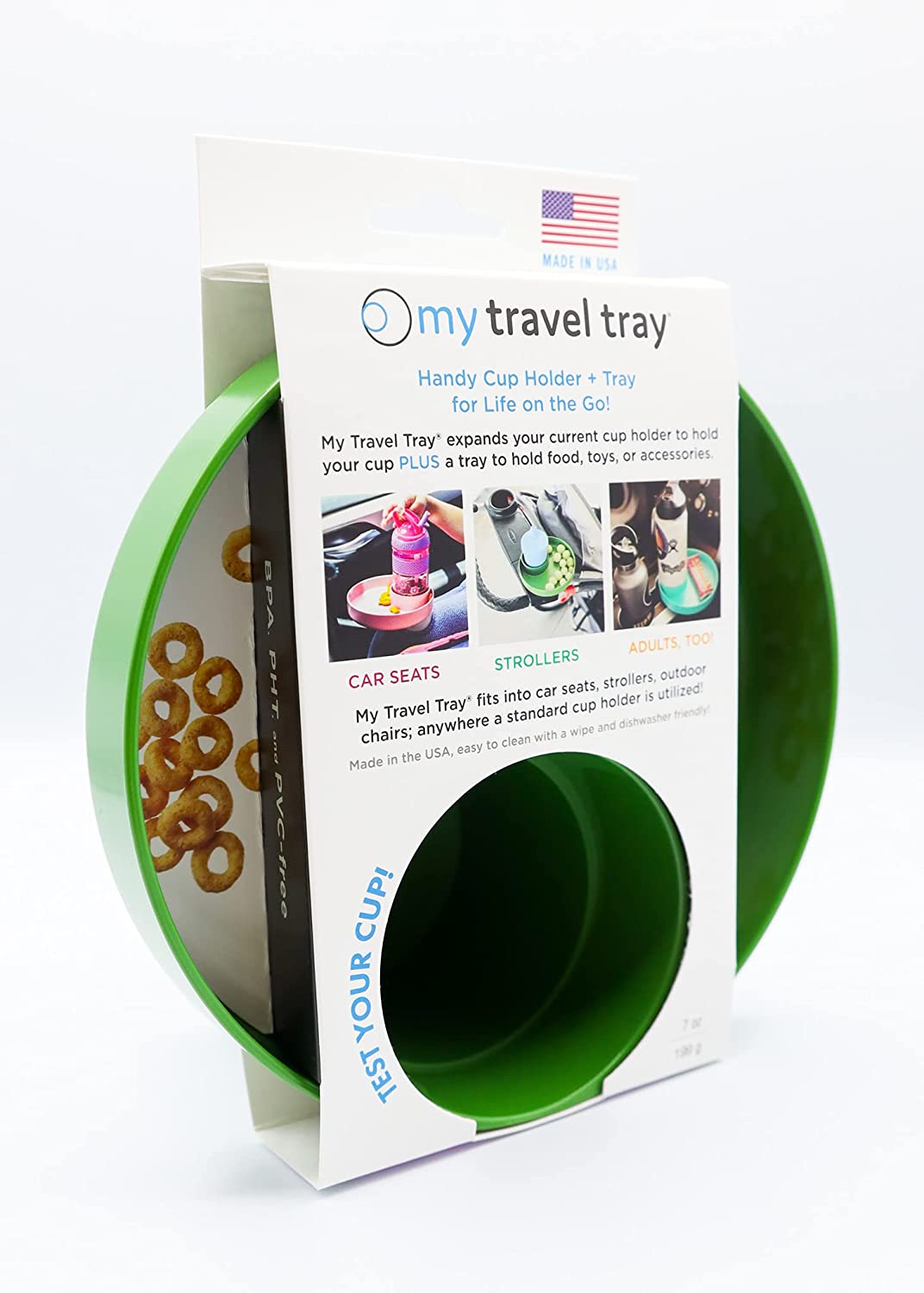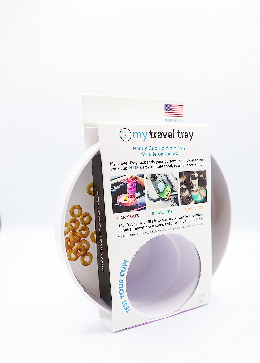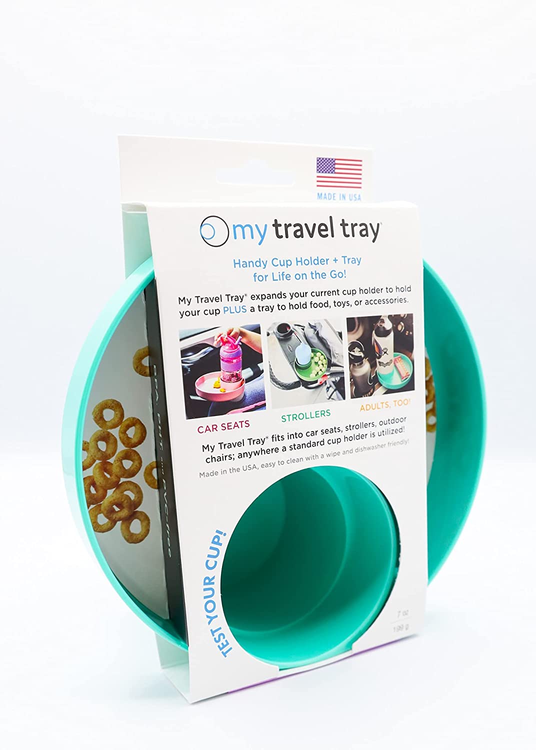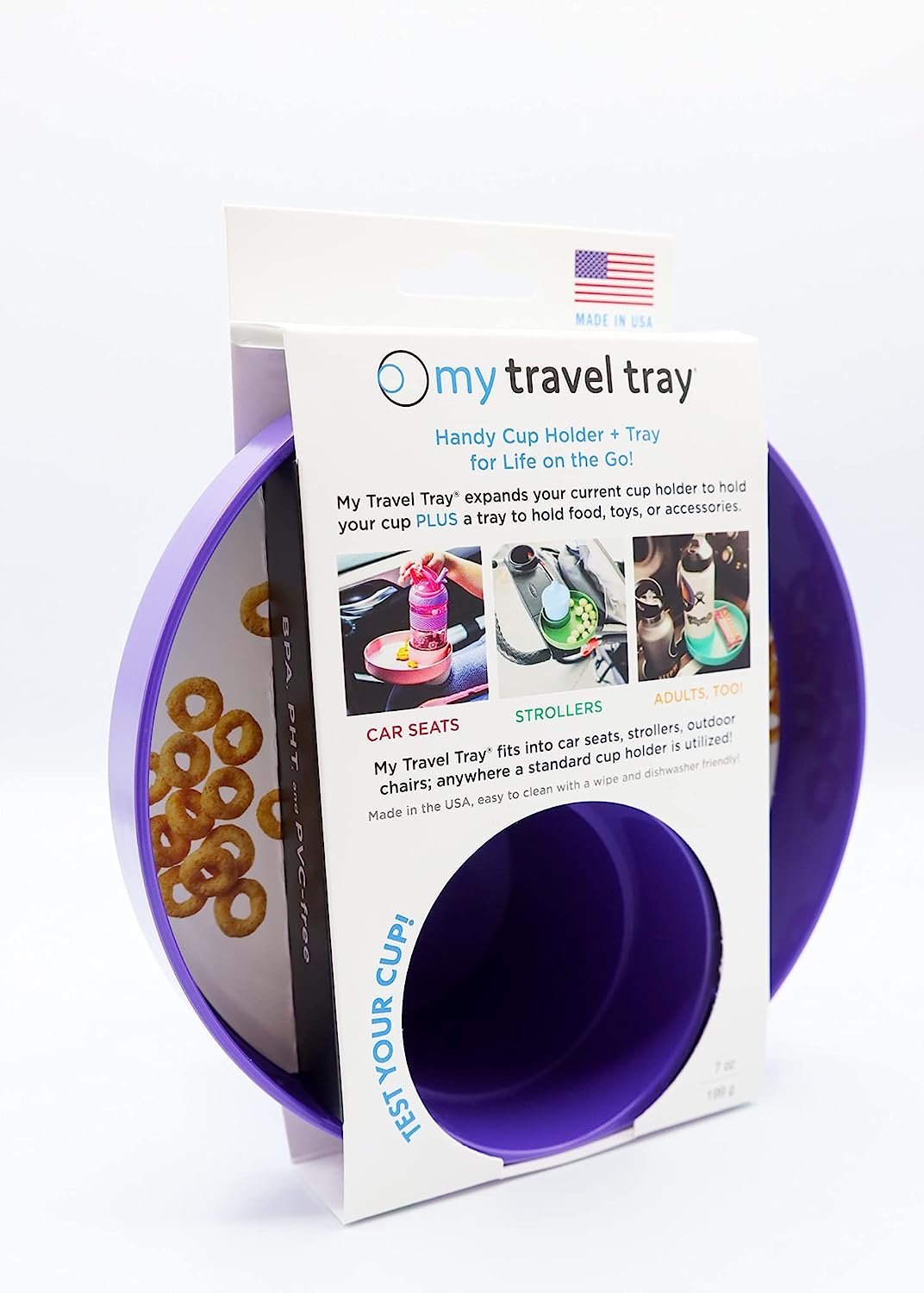 My Travel Tray utilizes your current cupholder, keeping your drinks and snacks within arms reach while out and about, helping keep everyone a little bit happier. My Travel Tray fits most cars, car seats, strollers, beach chairs, shopping carts, anywhere you can locate a cup holder! Whether you are zigging or zagging your way through life, keep your things secure! 100% Made in USA