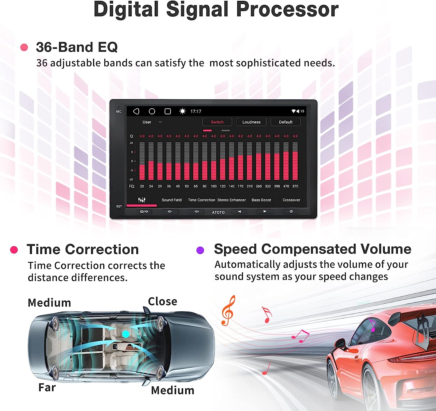 • 【DSP with Time Correction, SCVC & 36-band EQ, Preamp】The Digital Signal Processor makes it possible to equip A6 PF with: (1)Time Correction, aligning the time it takes for audio signals from each speaker to reach your ears; (2)Speed Compensated Volume, automatically adjusting volume as the speed changes, to adjust for road and wind noise; (3)36-band EQ, allowing deep customization for even the most sophisticated ears. The built-in max. 4*45W & RMS 4*24W amp offers great sound quality.