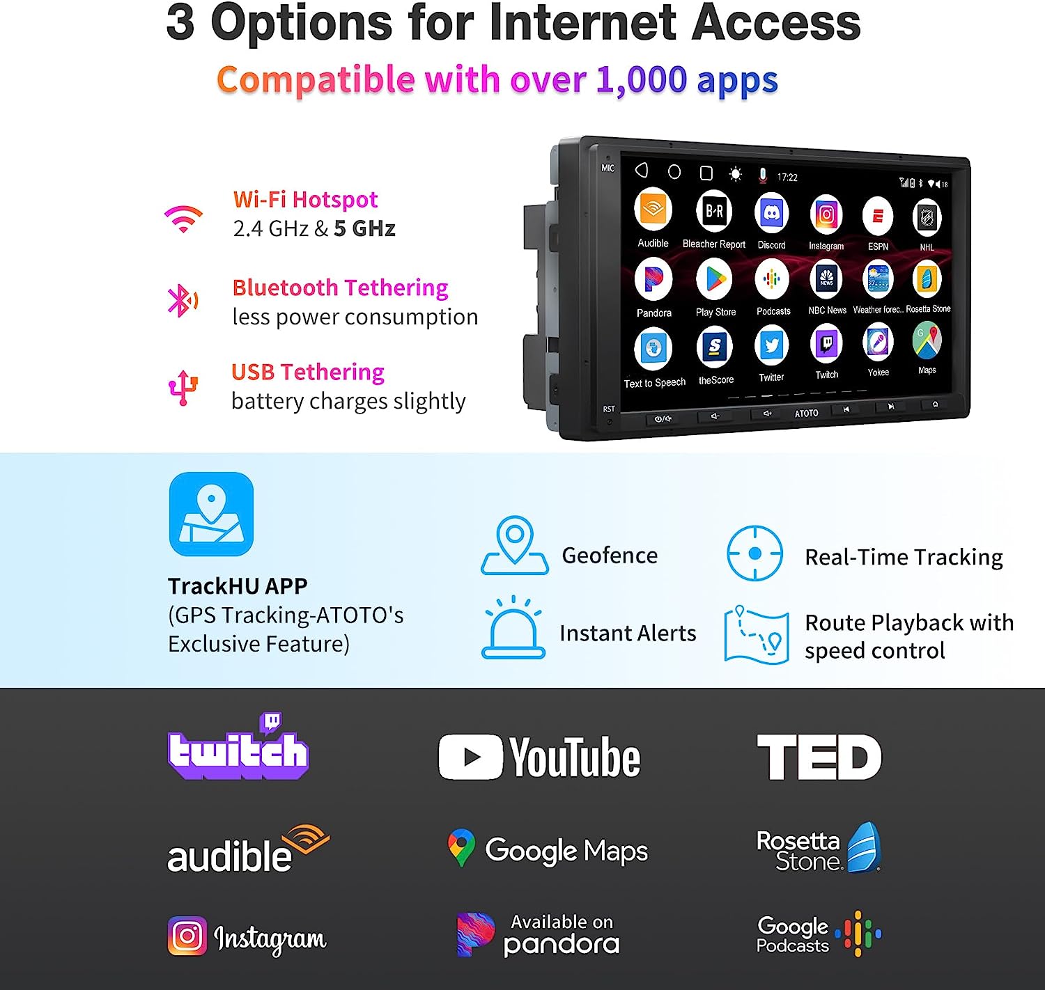 • 【3 Internet Accesses & Dual Bluetooth & GPS Tracking】①2.4 & 5 GHz Wi-Fi ensures you won't be stuck at the congested 2.4 GHz; ② Power-efficient Bluetooth 2 tethering of the dual Bluetooth; ③ATOTO's exclusive USB tethering that also charges your phone. Use TrackHU, ATOTO's exclusive GPS tracking app, for real-time tracking with a 15-second refresh, OsmAnd's 4-satellite positioning, track playback with speed control, detailed reports, and instant online/offline status and geofence alerts.